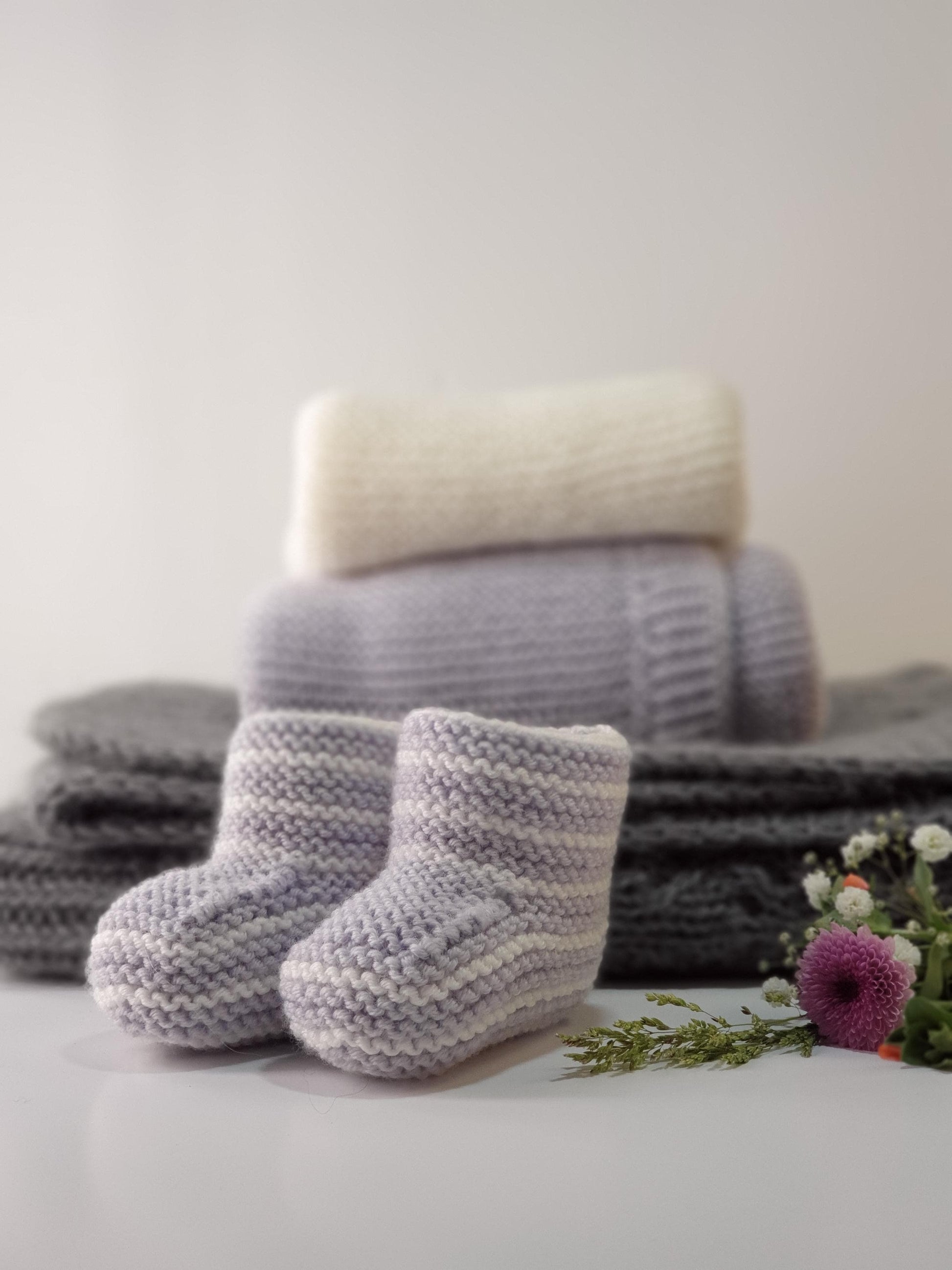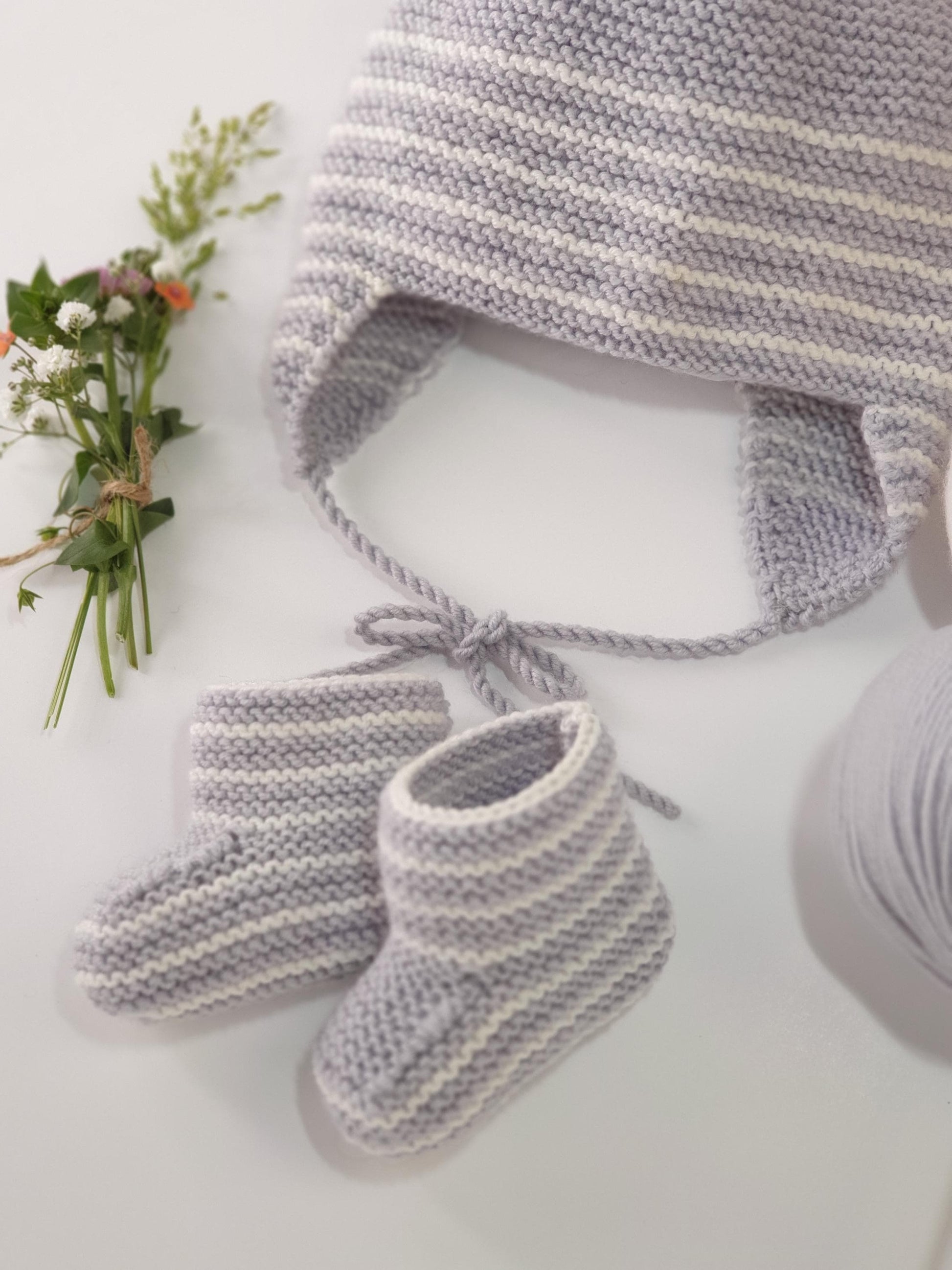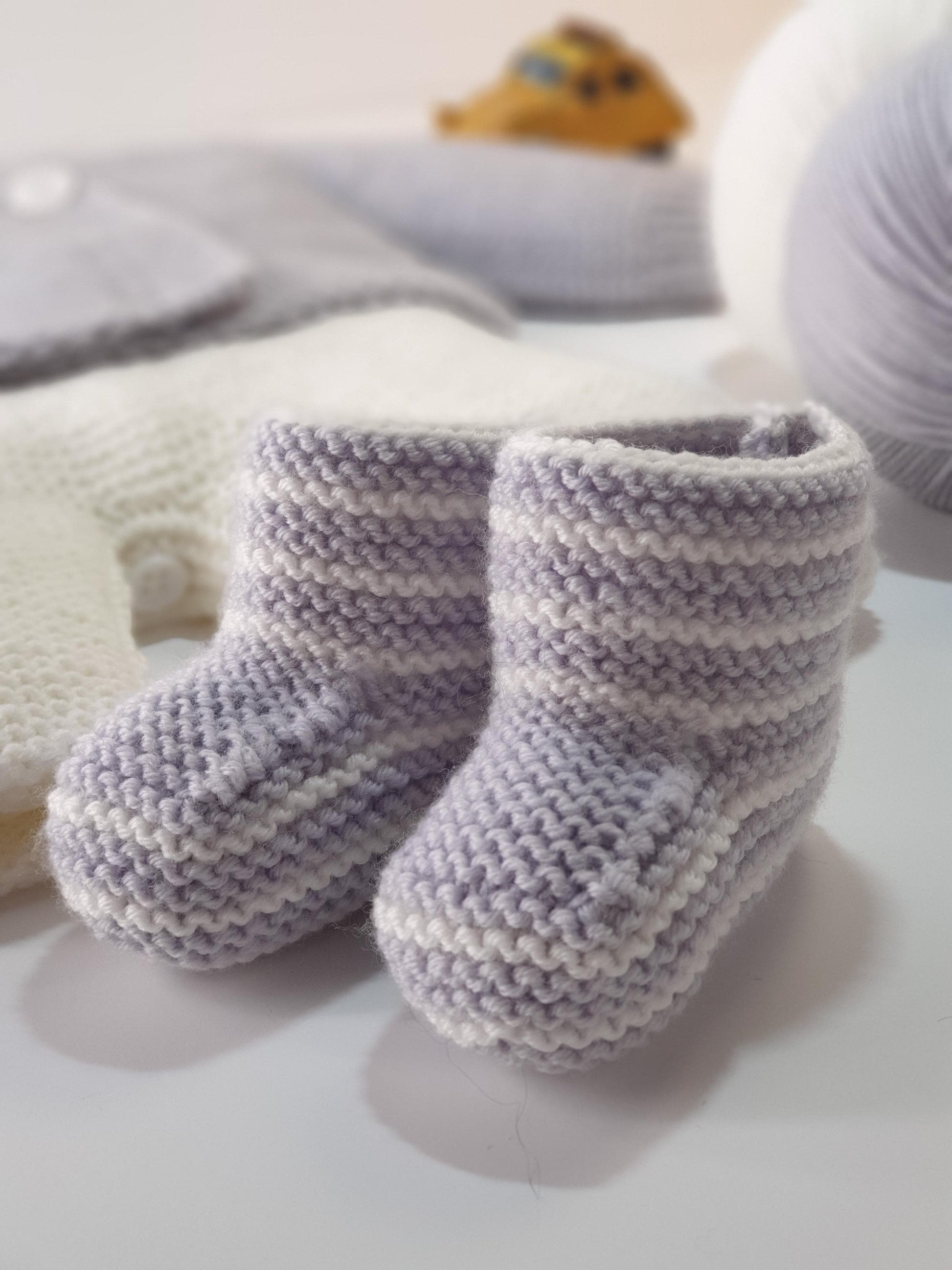 Cet ensemble modèle tricot naissance réalisé en point mousse est facile à tricoter.
