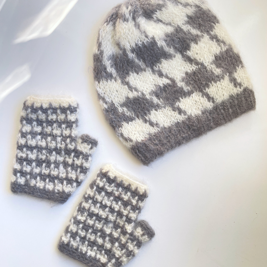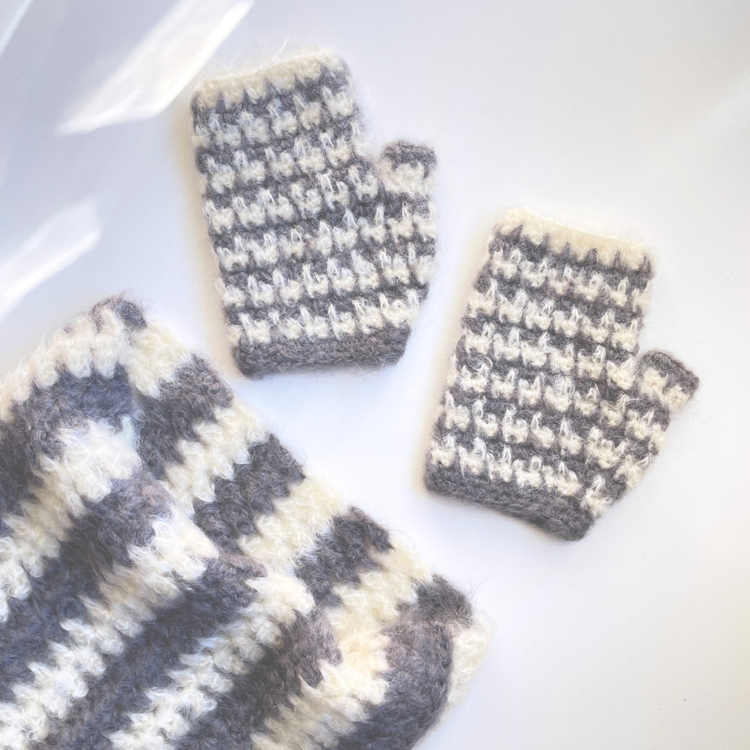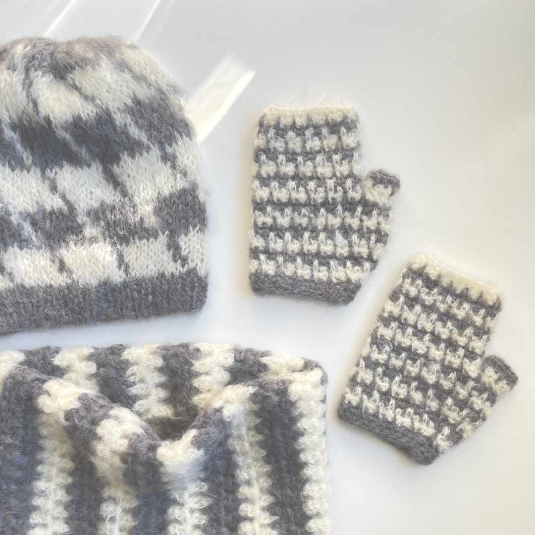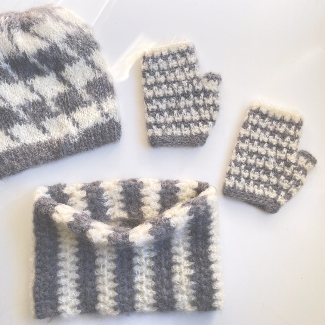 Les mitaines et le snood sont réalisés au crochet en suivant une rayure fantaisie facile et détaillée dans la fiche d'explication disponible avec le kit. Le bonnet et son motif jacquard pied de poule, eux se tricotent en un clin d'oeil avec notre fil Vénus : un mohair doux et épais.