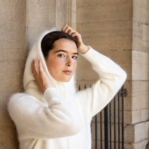 Le pull Cerbère se tricote en 2 panneaux, d'un poignet à l'autre dans nos fils Angora Douceur et Victoria.