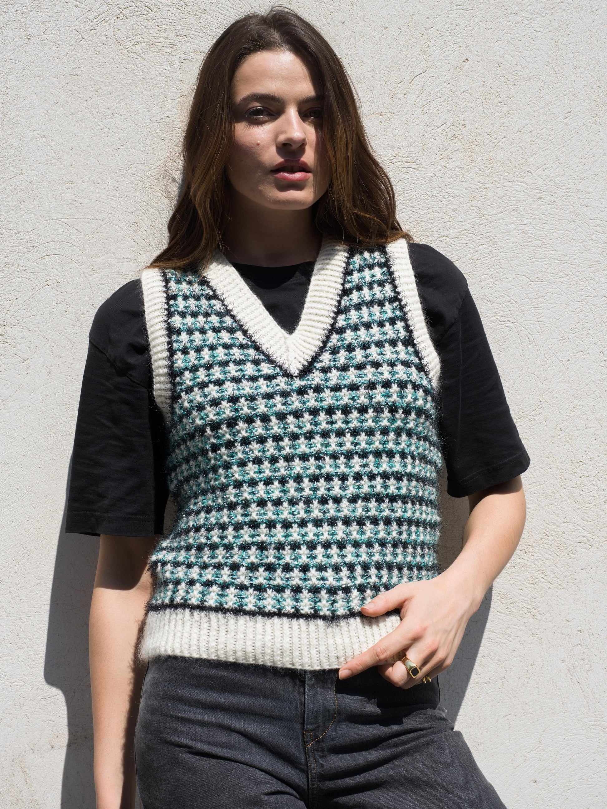 La coupe de ce modèle est droite, ce qui lui confère un look moderne et stylé lorsqu'il est porté par-dessus une petite chemise ou un t-shirt. Le point utilisé est réalisable sans difficulté majeure, mais demande de l'attention pour un résultat parfait. Les bords côtes sont travaillés avec notre fil Mérinos Extrafine Naturel, ajoutant une touche lumineuse et vintage à l'ensemble.