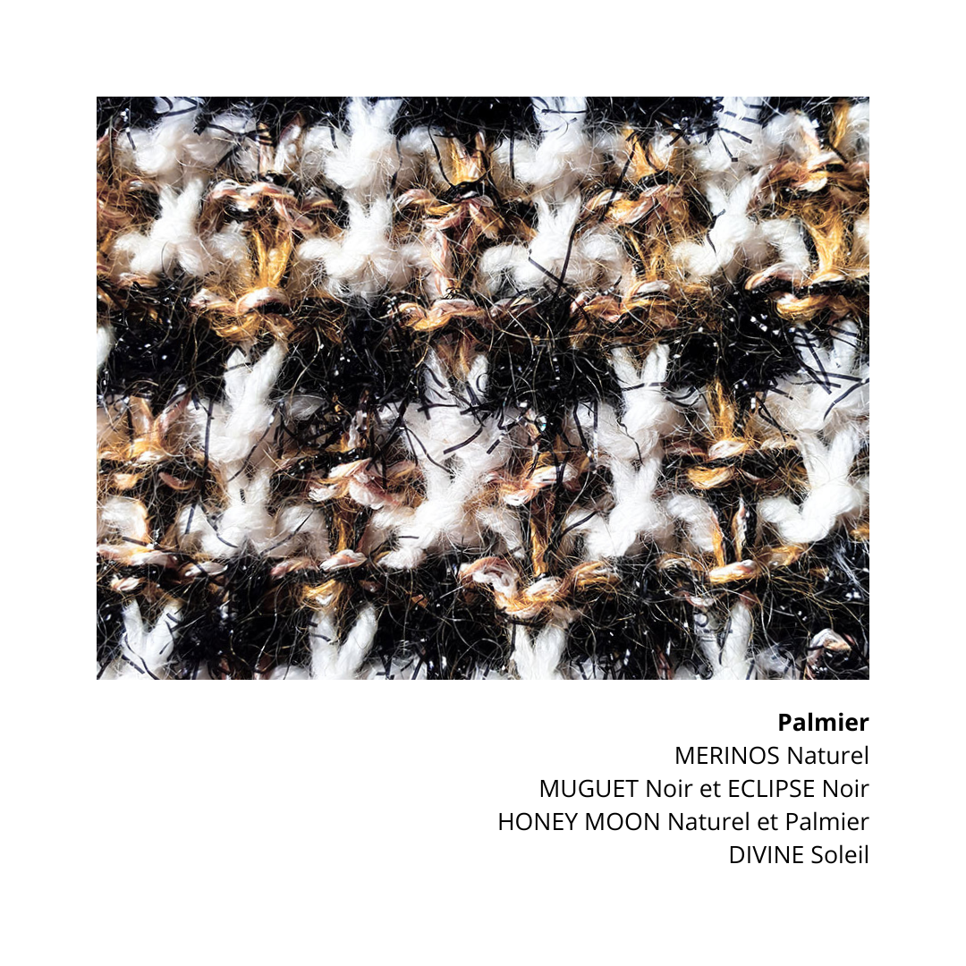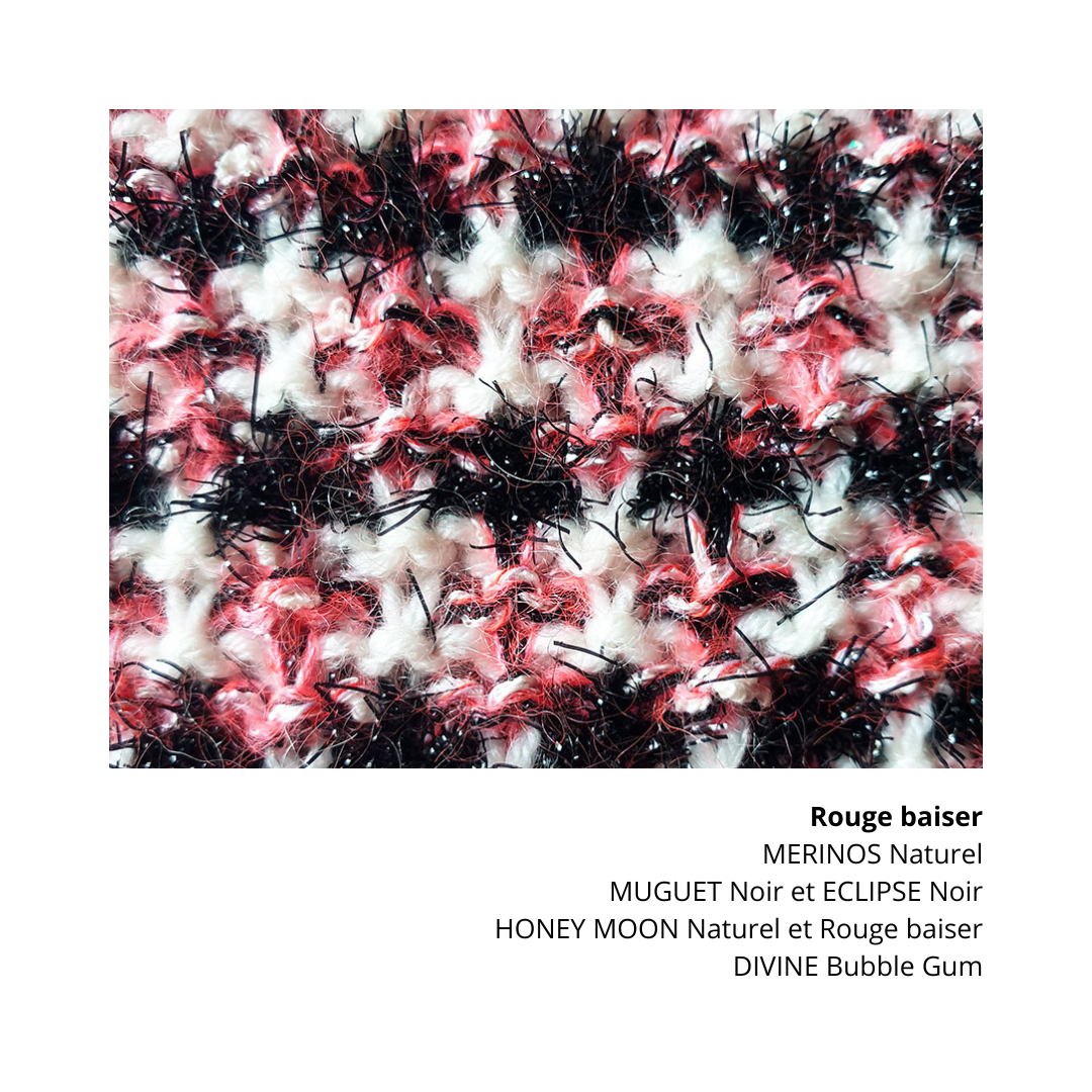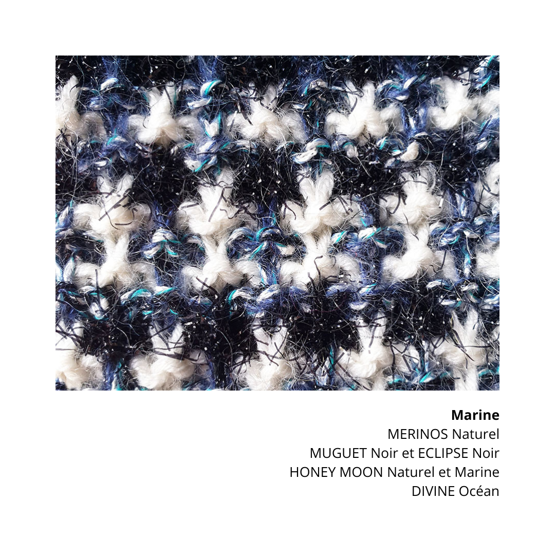 Découvrez le charme sophistiqué du point fantaisie du modèle Brooklyn créé par notre styliste Anne, qui joue habilement avec les matières et les textures. Les emmanchures et l'encolure sont mises en valeur par quelques rangées de notre fil noir brillant, le Muguet.