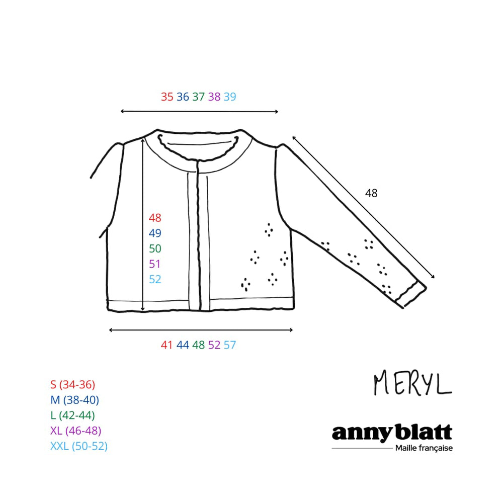 Le cardigan à tricoter Meryl est assez court et ses manches sont 3/4. Si vous hésitez entre deux tailles, prenez la taille au dessus.