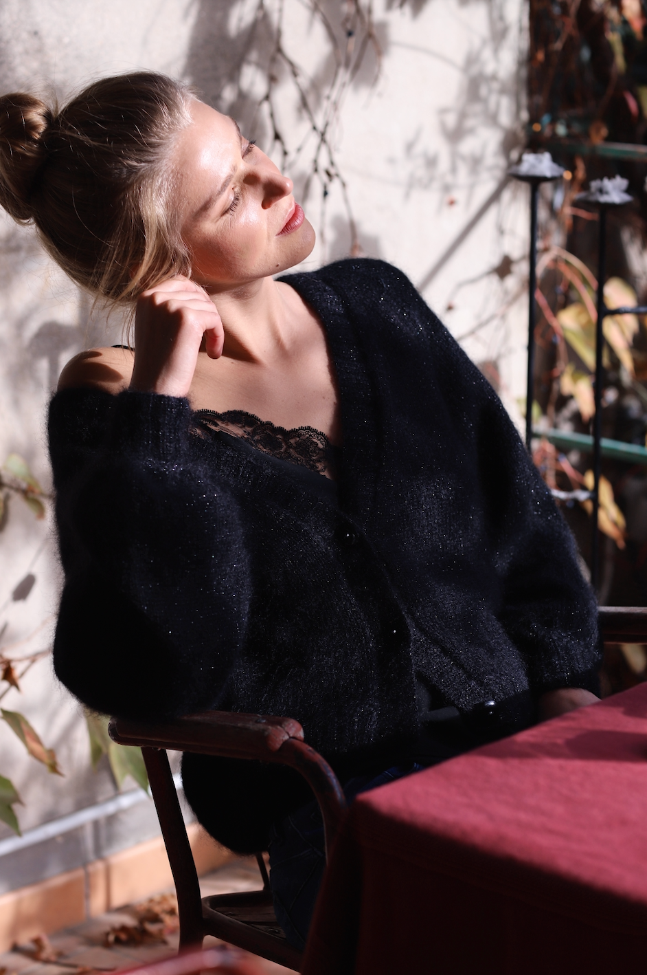 Il peut se porter à l'endroit en version gilet, laissant dégager une épaule ou non, ou à l'envers, boutonnage dans le dos en version à même la peau. C'est un basique de tous les jours mais qui saura se parer de 1000 feux au soleil ou sous les spotlights grâce à son léger fil irisé.