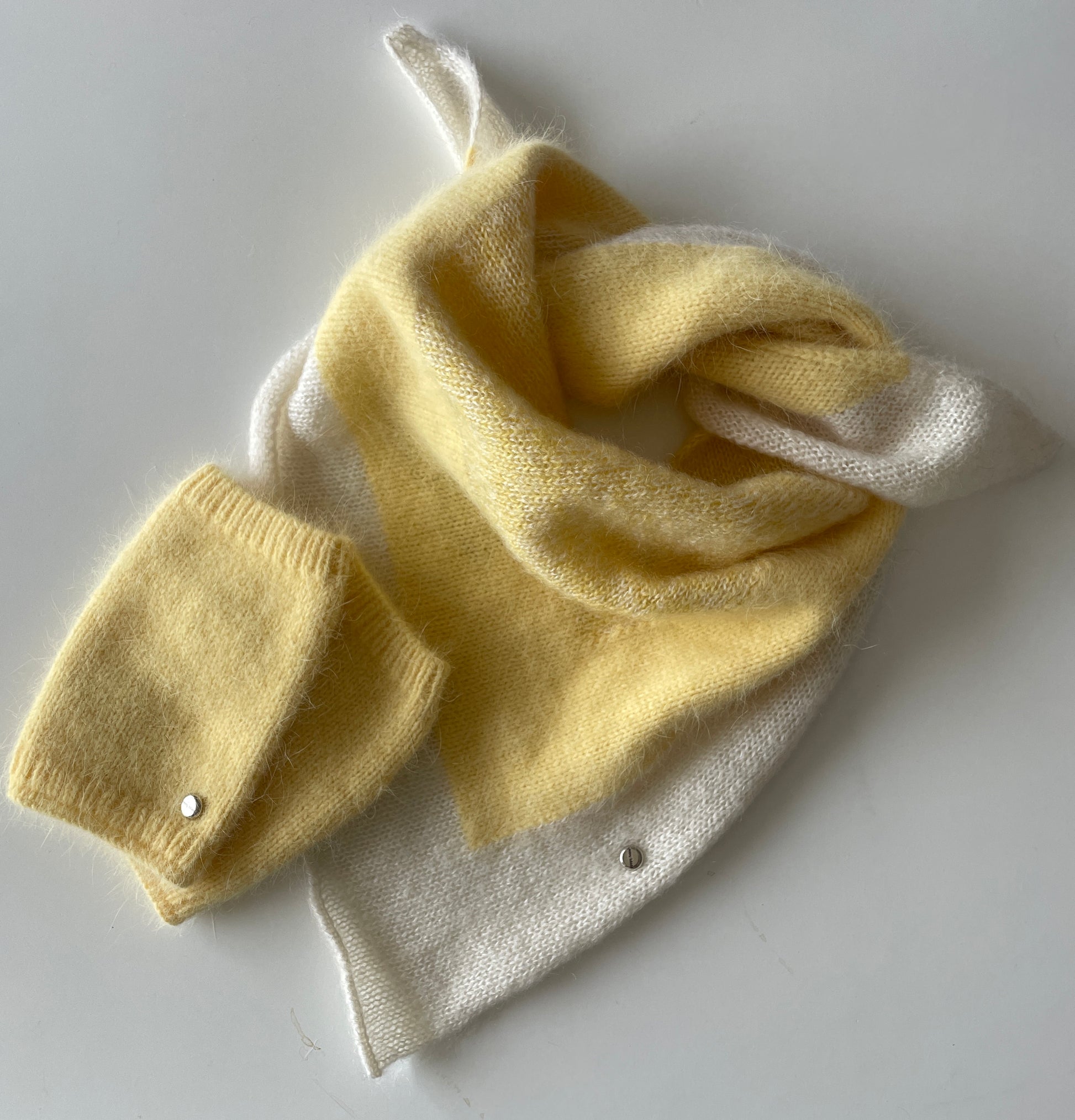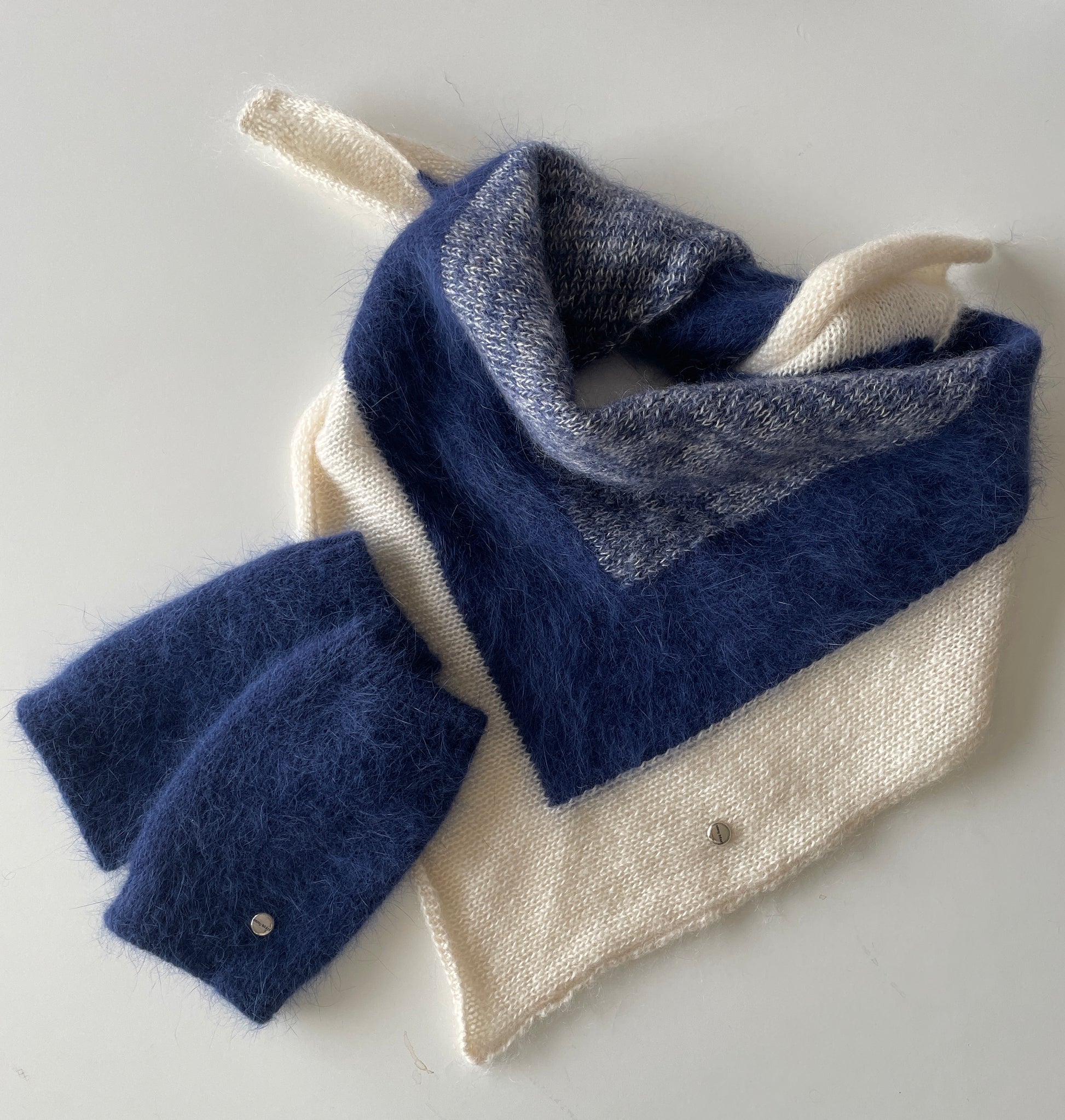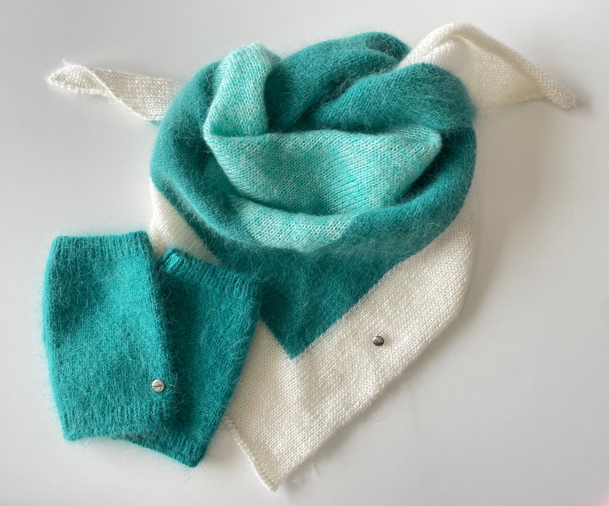 - Foulard triangulaire à nouer dans le cou et une paire de mitaines en angora assorti.
