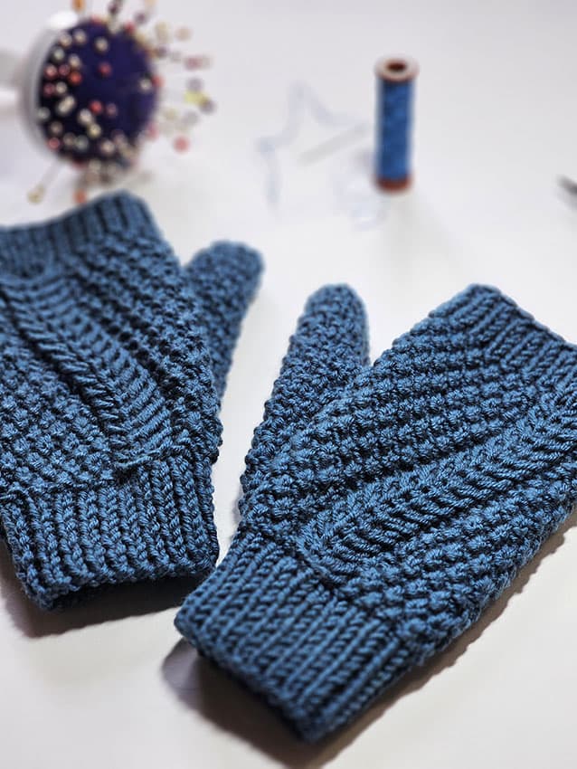 - Motif graphique asymétrique sur le dessus des mitaines obtenus grâce à des torsades fantaisie.