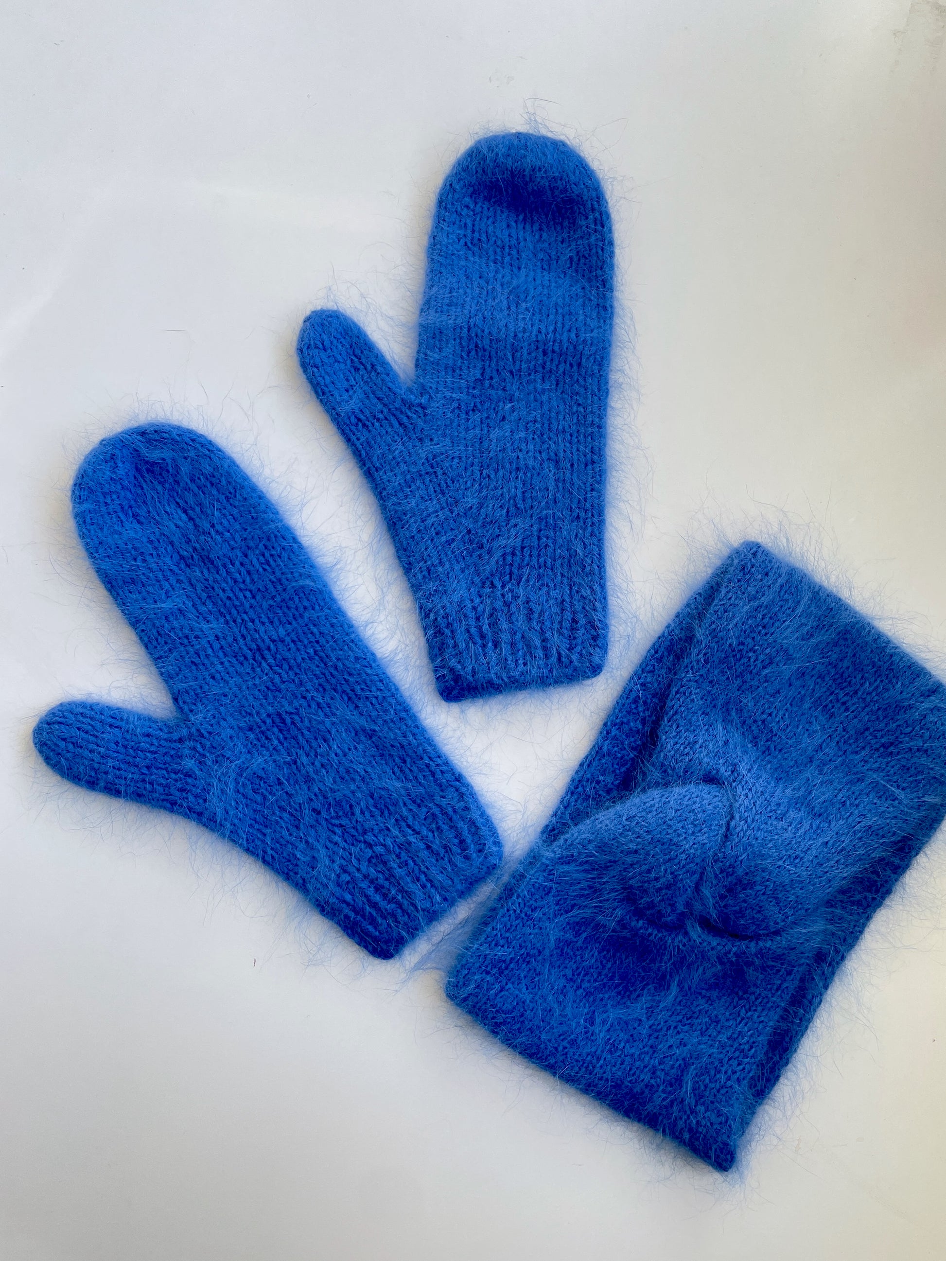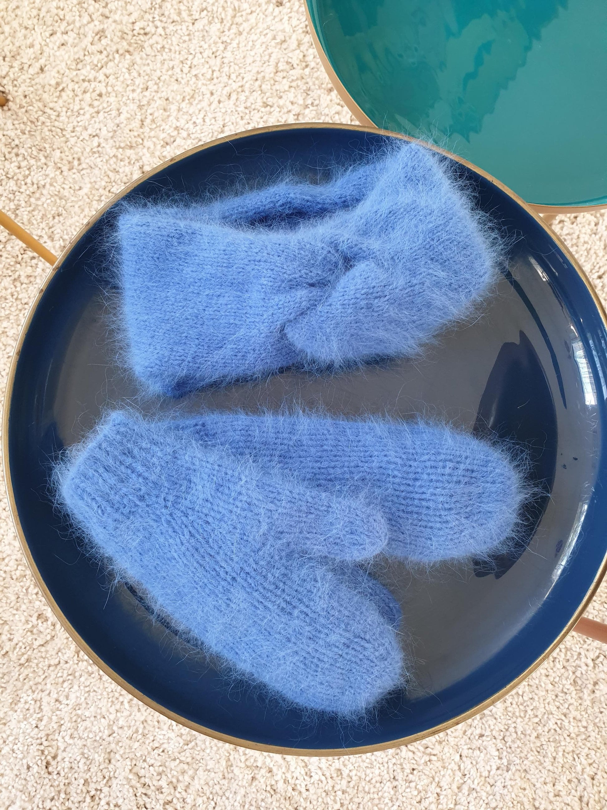 Le bandeau se tricote en deux parties qui se cousent ensemble pour former ce joli effet noué sur le dessus. Les moufles, qui se tricotent en jersey après quelques centimètres de côtes 1/1 pour marquer le poignet, demanderont de l'attention pour la réalisation du pouce, un peu plus technique.