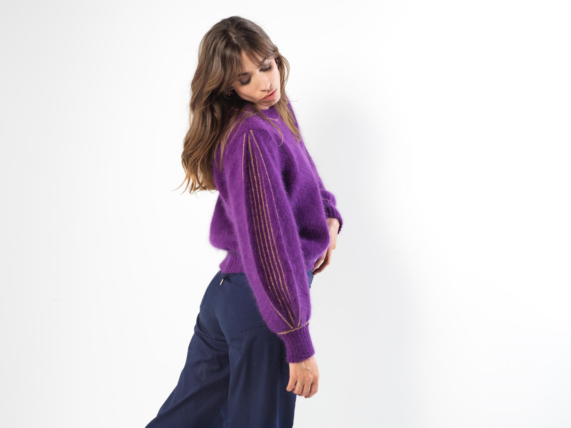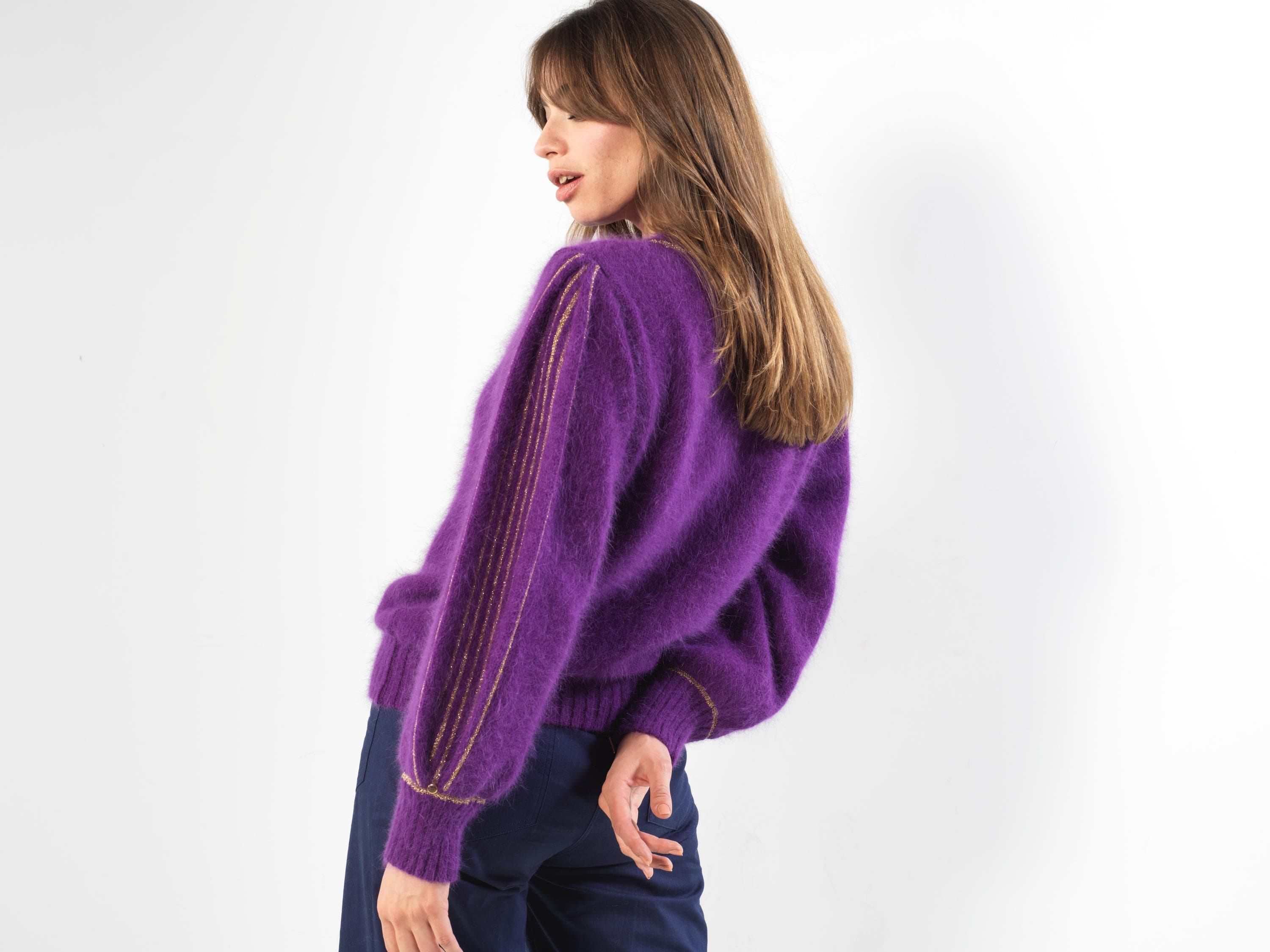 Tricoté dans un fil Angora Douceur 100% français orné de petites touches de fil doré. À offrir ou à s'offrir : le pull Alix est une valeur sûre !