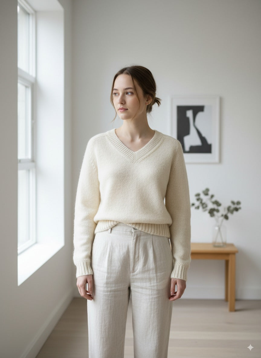 Le pull Amael se distingue par son col V large en côtes 1/1 et ses manches marteau. Sa forme, sa matière et les détails de points utilisés offrent une silhouette travaillée et sobre à la fois.