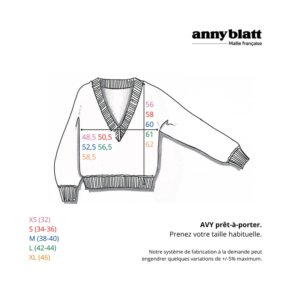 Avy est un pull à col V, classique et élégant, qui trouvera sa place dans toutes les garde-robes. Sa coupe droite, assez près du corps, vous assure une allure raffinée. Si vous hésitez entre deux tailles, prenez celle au dessus.