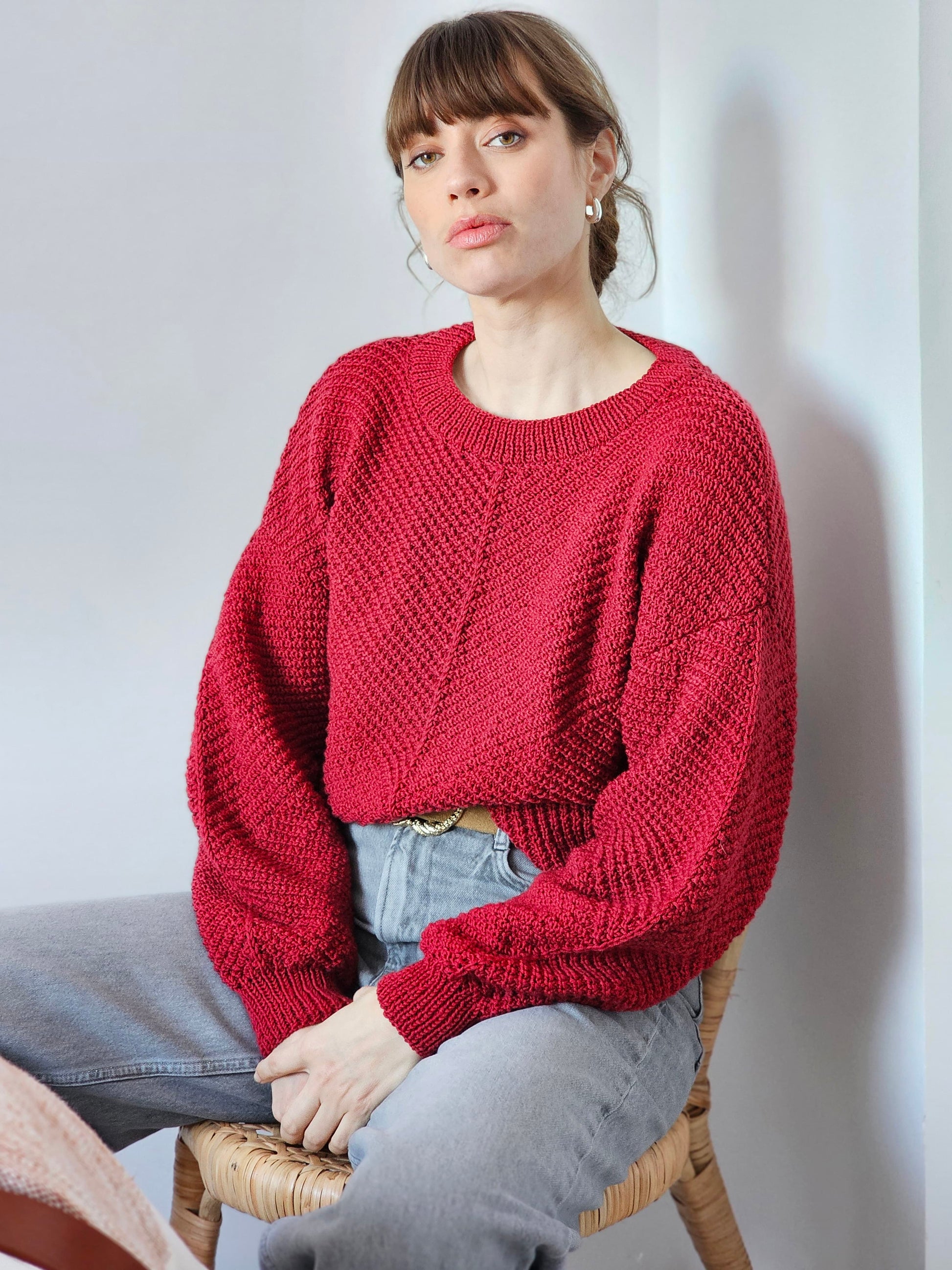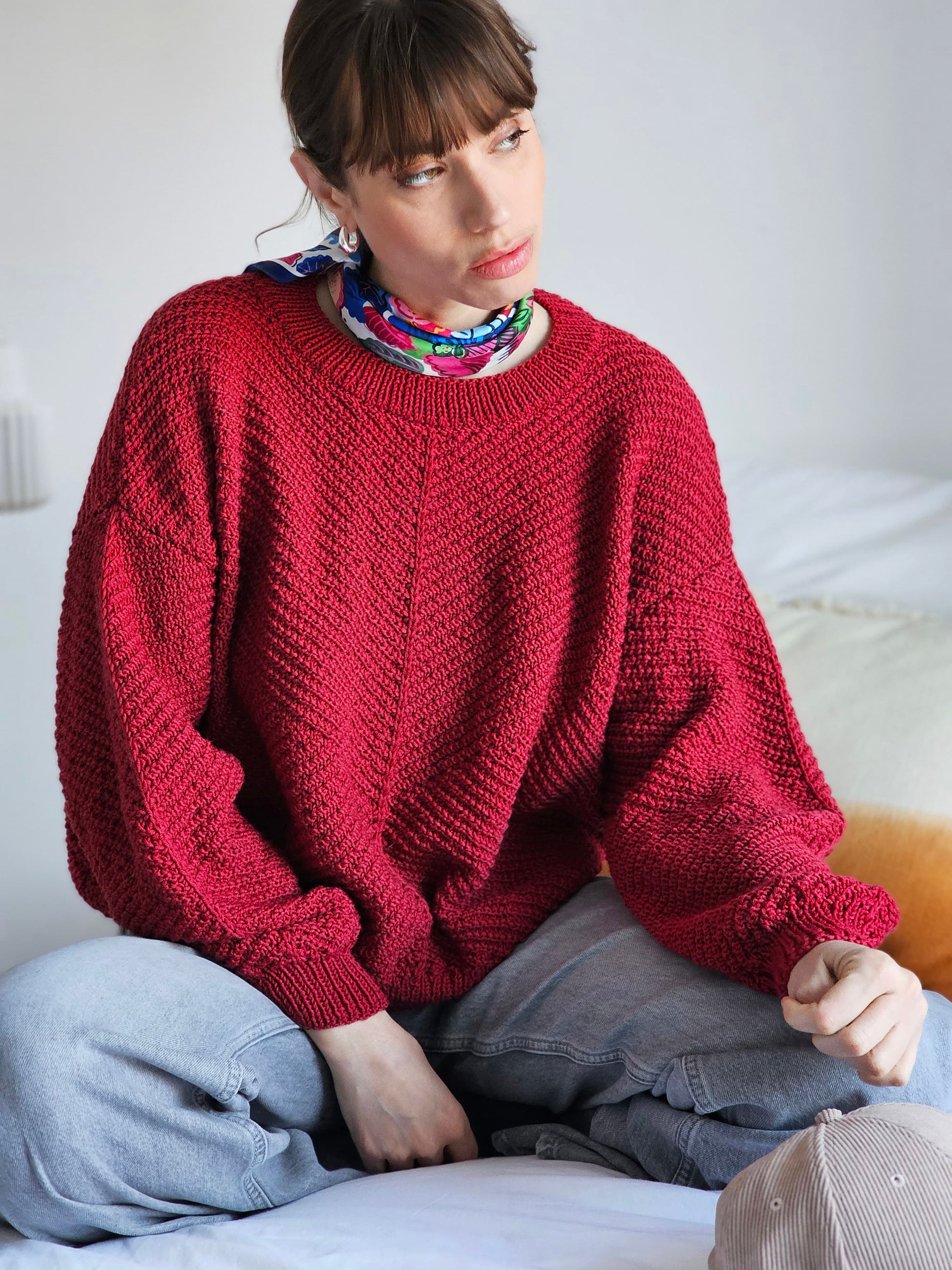 Ce modèle basique en mérinos se distingue par un jeu graphique texturé et subtil qui habille l’ensemble du pull. Ce modèle est un essentiel à tricoter et à porter : un classique revisité pour un style naturel et raffiné.