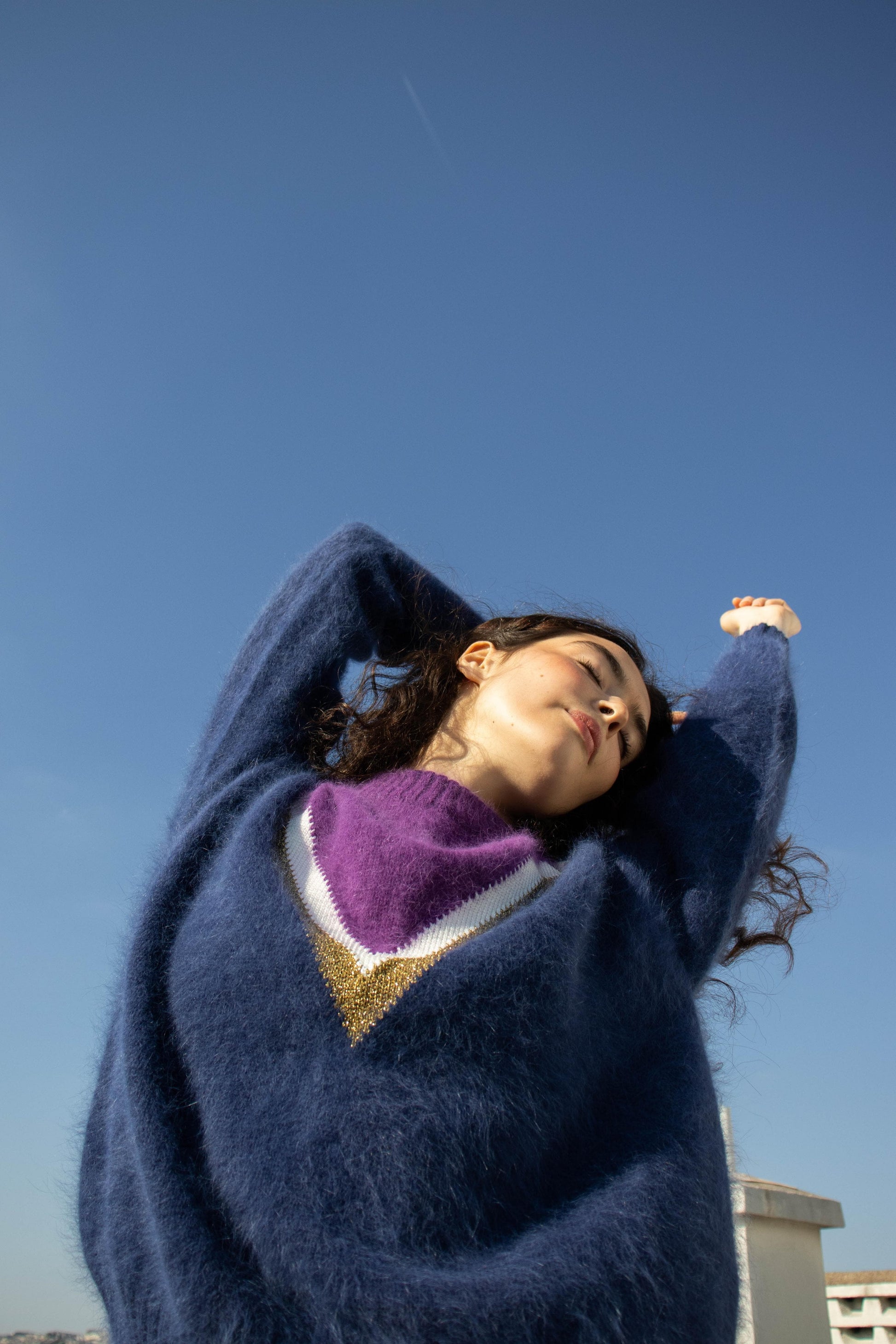 La maille, somptueuse et ultra douce, marie la chaleur naturelle de l’angora français et de la laine. Chaque pièce naît dans notre atelier en France 🇫🇷, selon un savoir-faire local, sans sur-production, pour un vestiaire qui dure et se transmet.