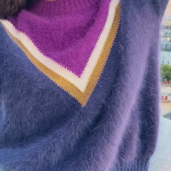 Notre fil Angora Douceur (50% Angora/50% Mérinos) compose majoritairement ce pull.