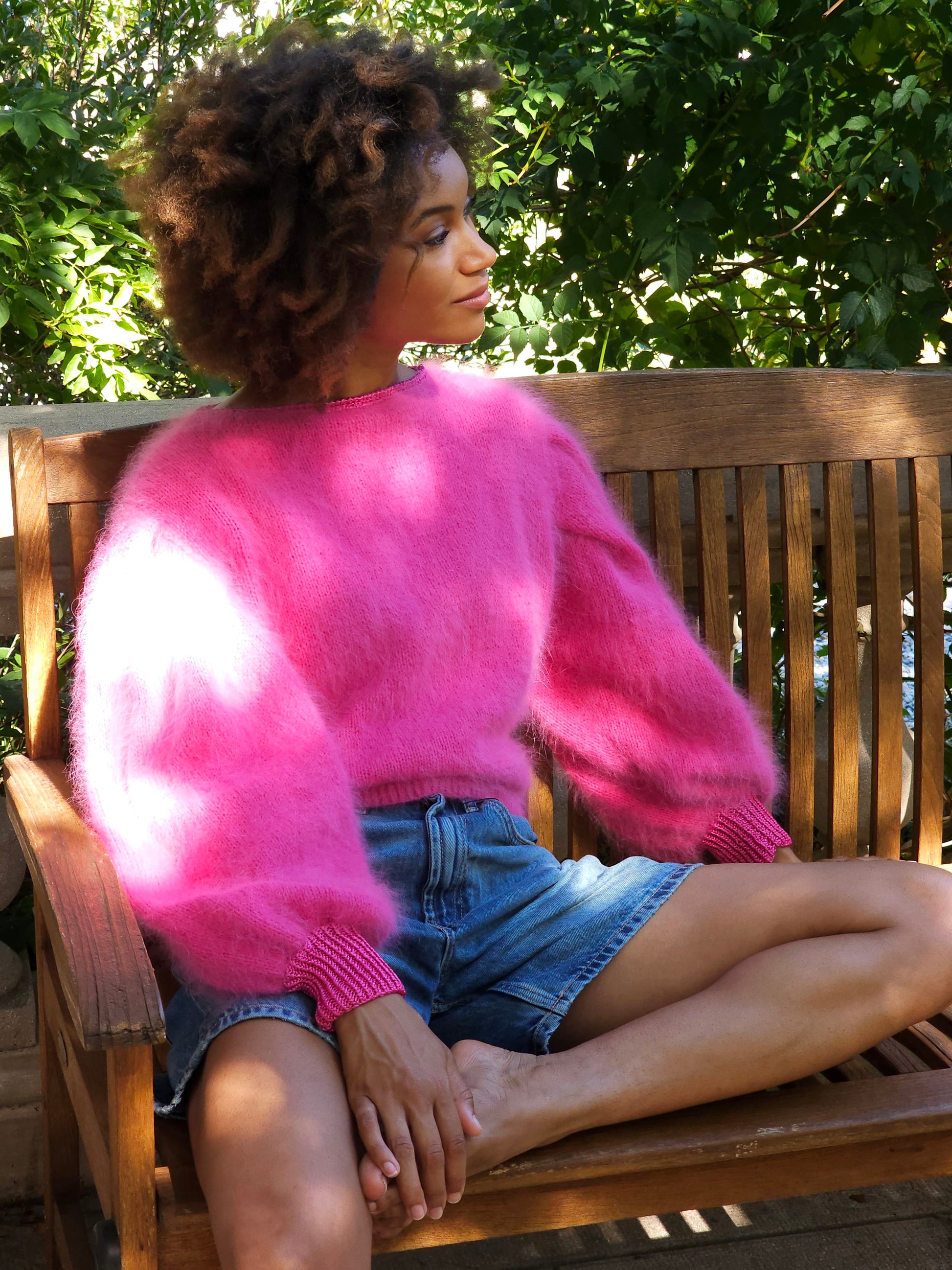 Les bords côtes des poignets sont travaillés en fil ruban satiné assorti pour une touche lumineuse qui sublime le rendu poilu de l'Angora. Les pelotes utilisées sont entièrement fabriquées en France à partir de matières naturelles : 50% d'Angora français, 50% de laine et rien d'autre.