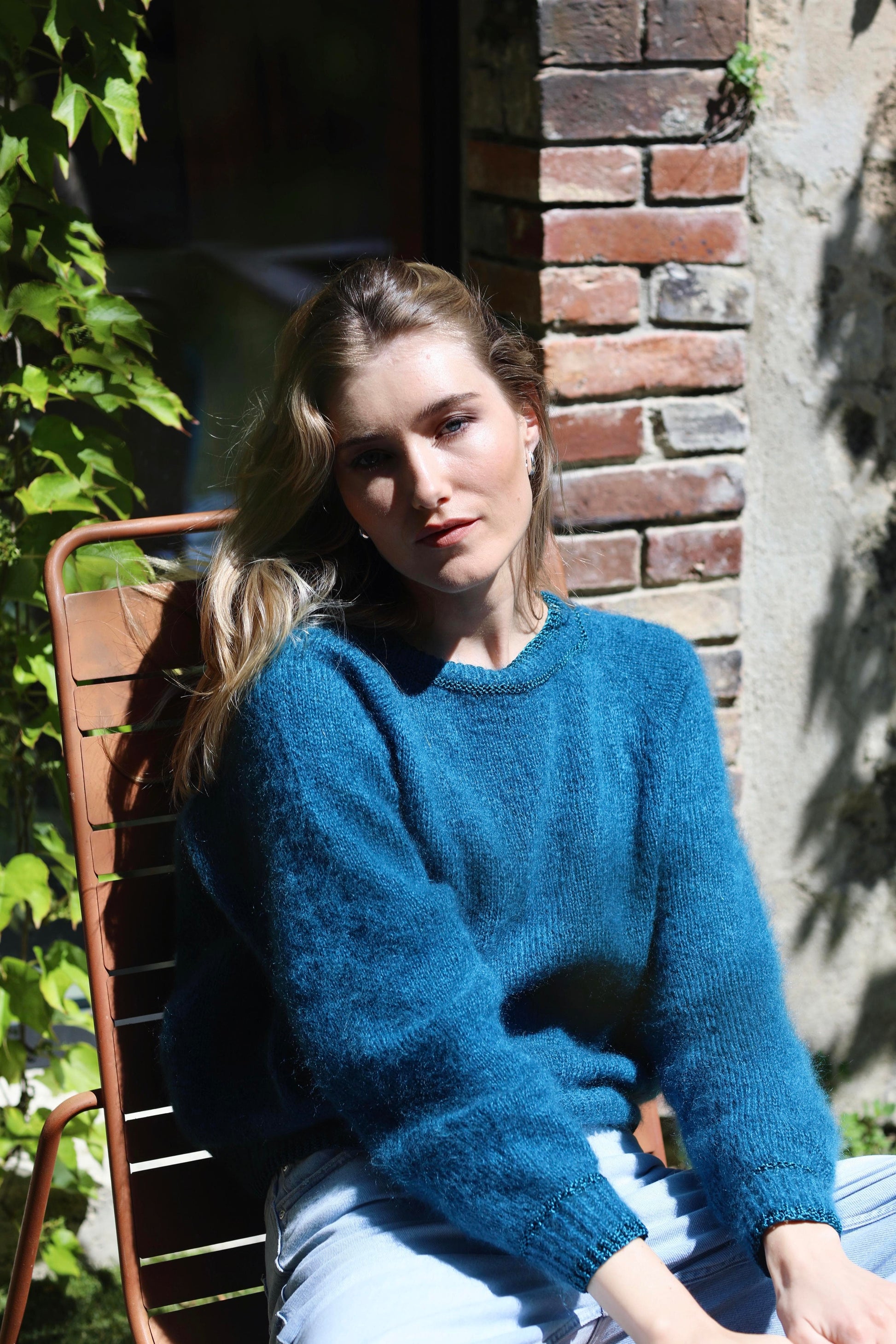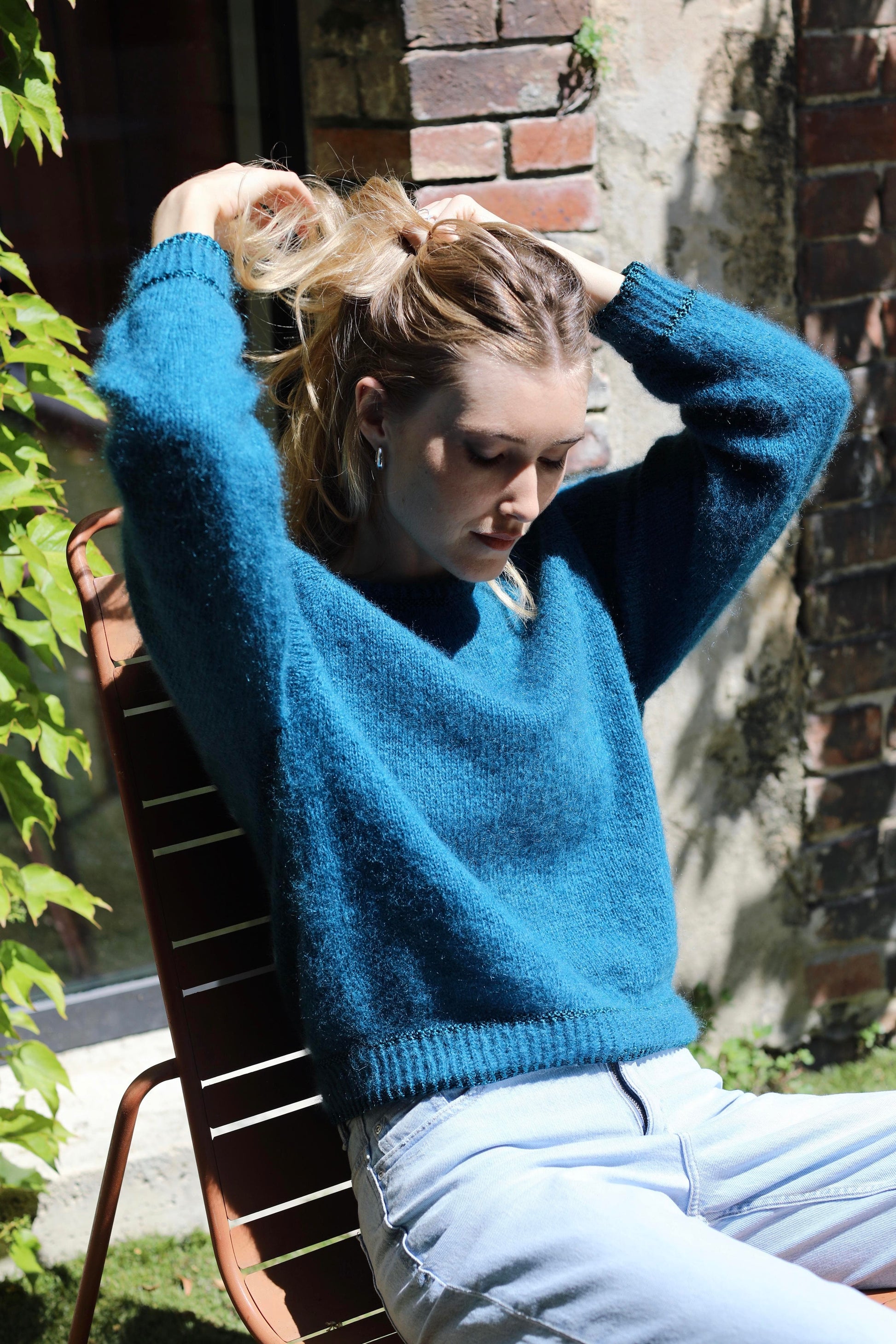 Découvrez le charme intemporel du pull Delphine à tricoter de haut en bas avec des aiguilles circulaires et le fil Honey Moon d'Anny Blatt.