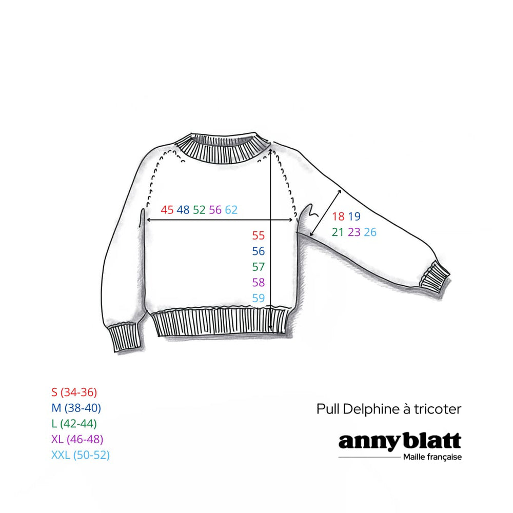 L'encolure du pull Delphine, ainsi que les poignets et le bas, sont sublimés par quelques rangs réalisés avec le fil ruban Victoria, en ton sur ton. Cette touche délicate est une véritable signature d'Anny Blatt, ajoutant une note sophistiquée et élégante à ce modèle.