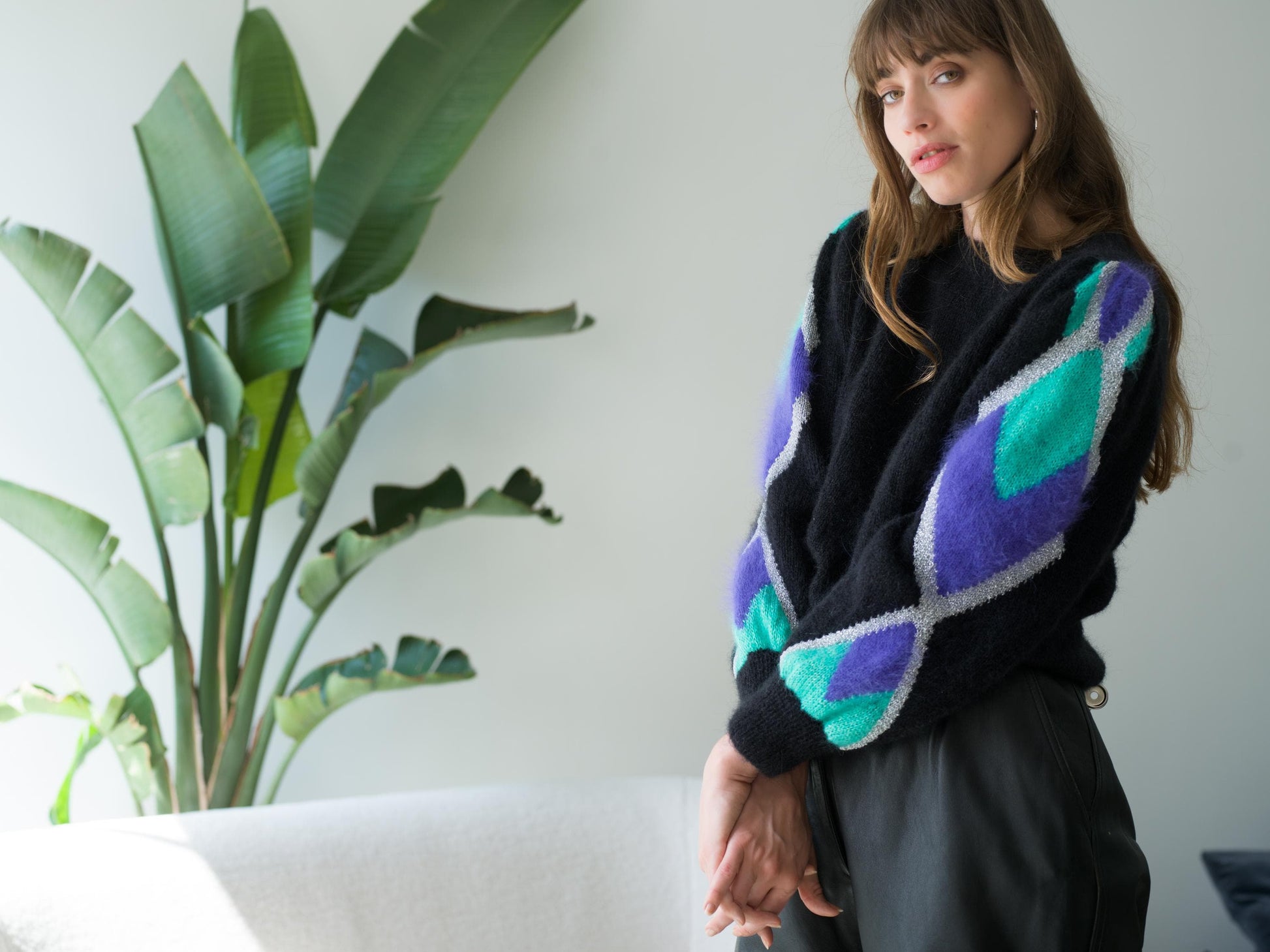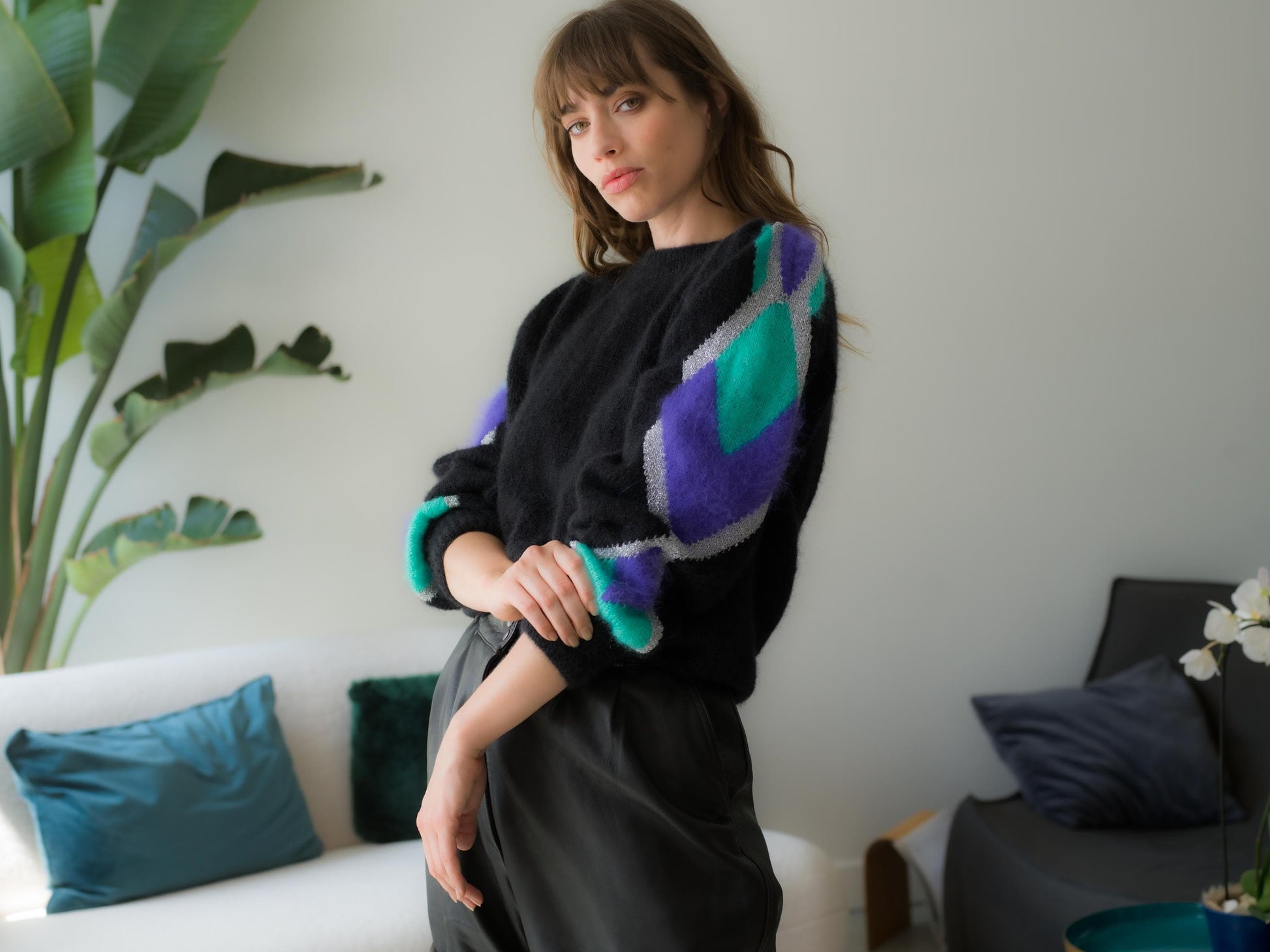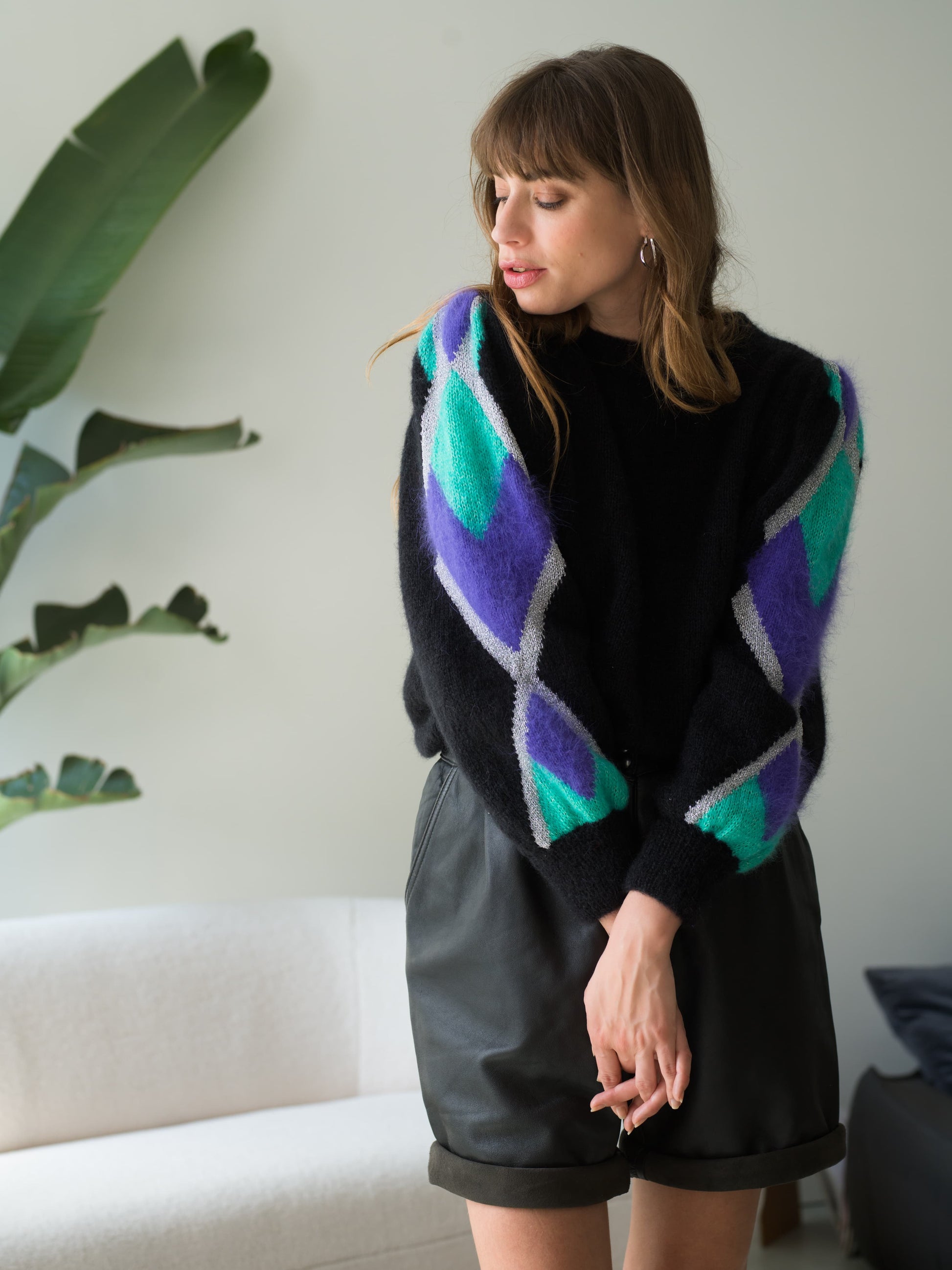 Sa coupe est droite et il est tricoté à plat, de bas en haut. Les manches, quant à elles, sont travaillées selon une grille jacquard en intarsia avec un motif géométrique coloré original.