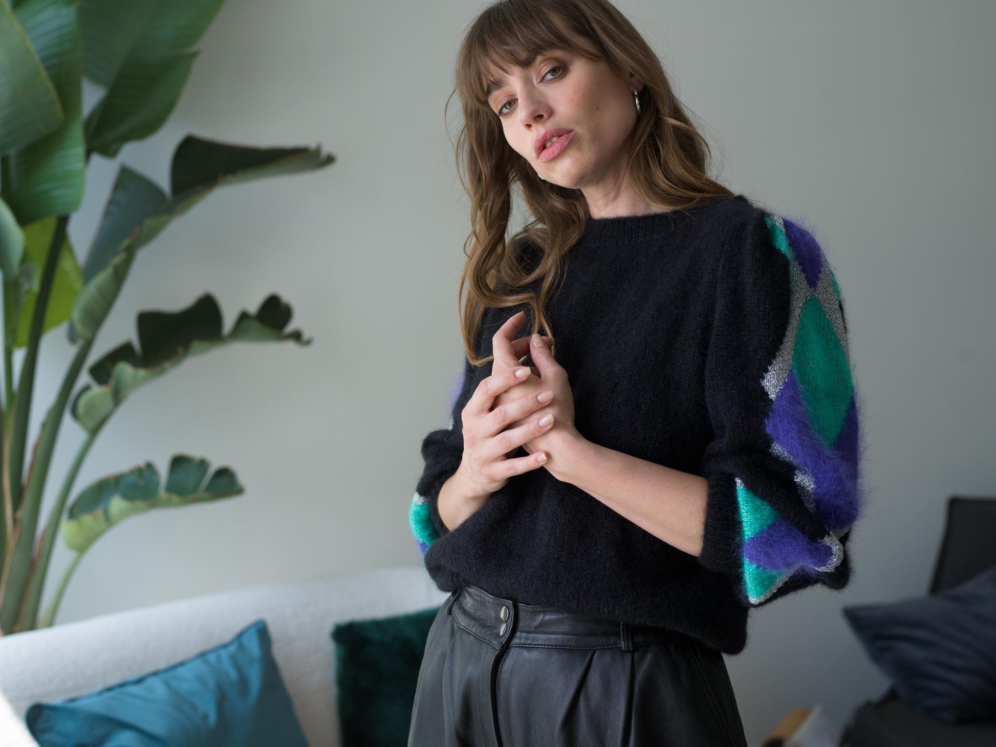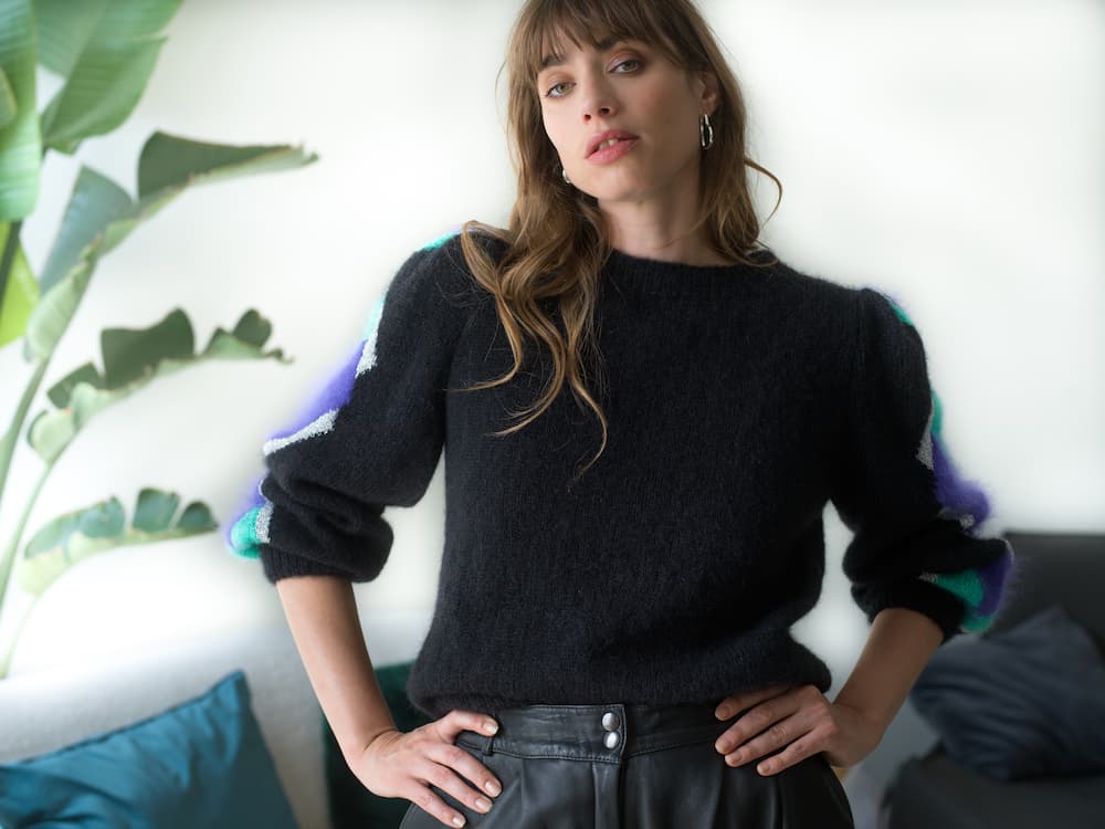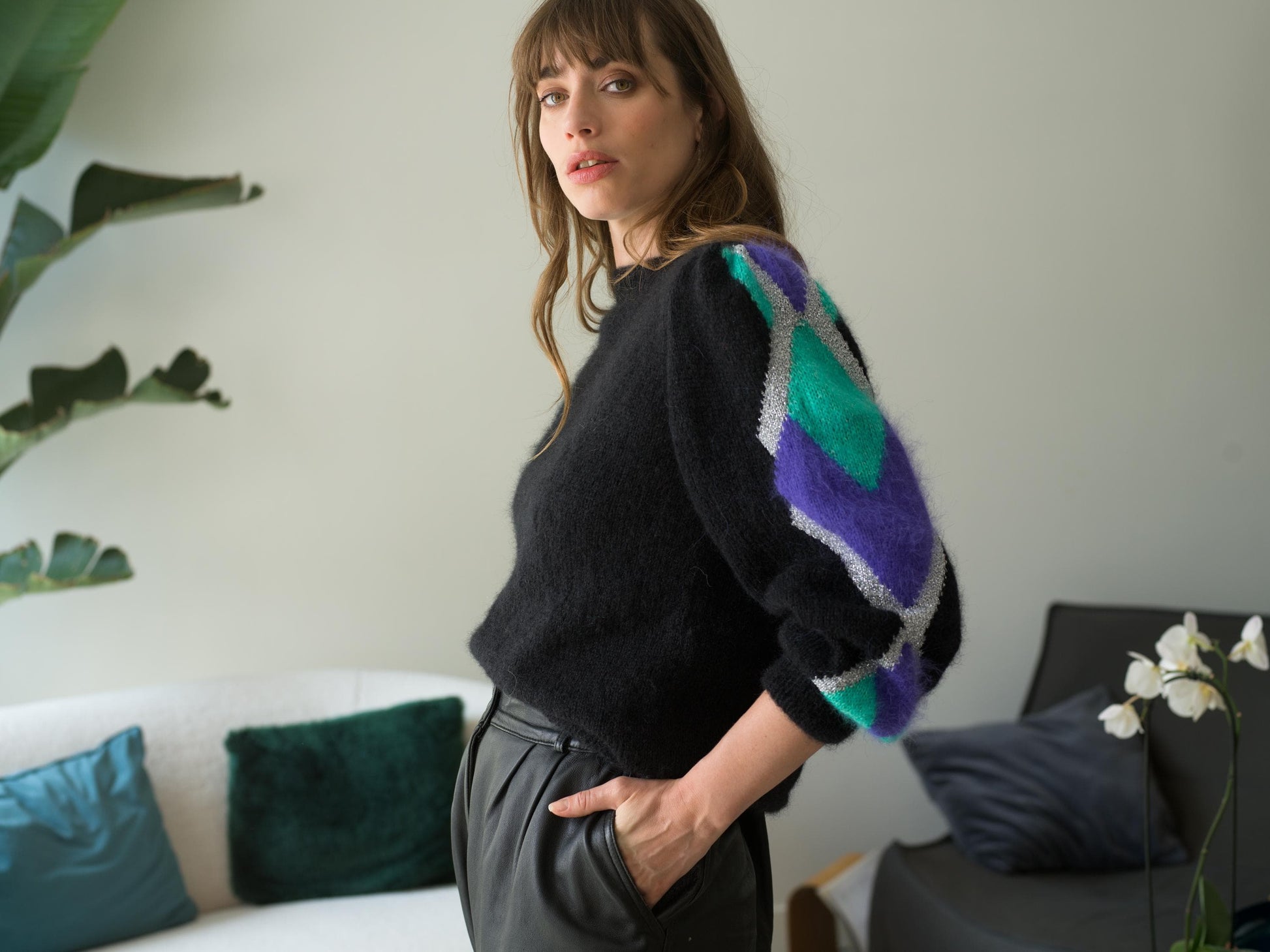 Le travail minutieux de ce modèle Anny Blatt s'exprime principalement sur les manches, où différents fils et matières se mélangent pour apporter relief, texture et brillance. Les têtes de manches sont joliment froncées lors du montage, ajoutant une touche supplémentaire d'élégance.