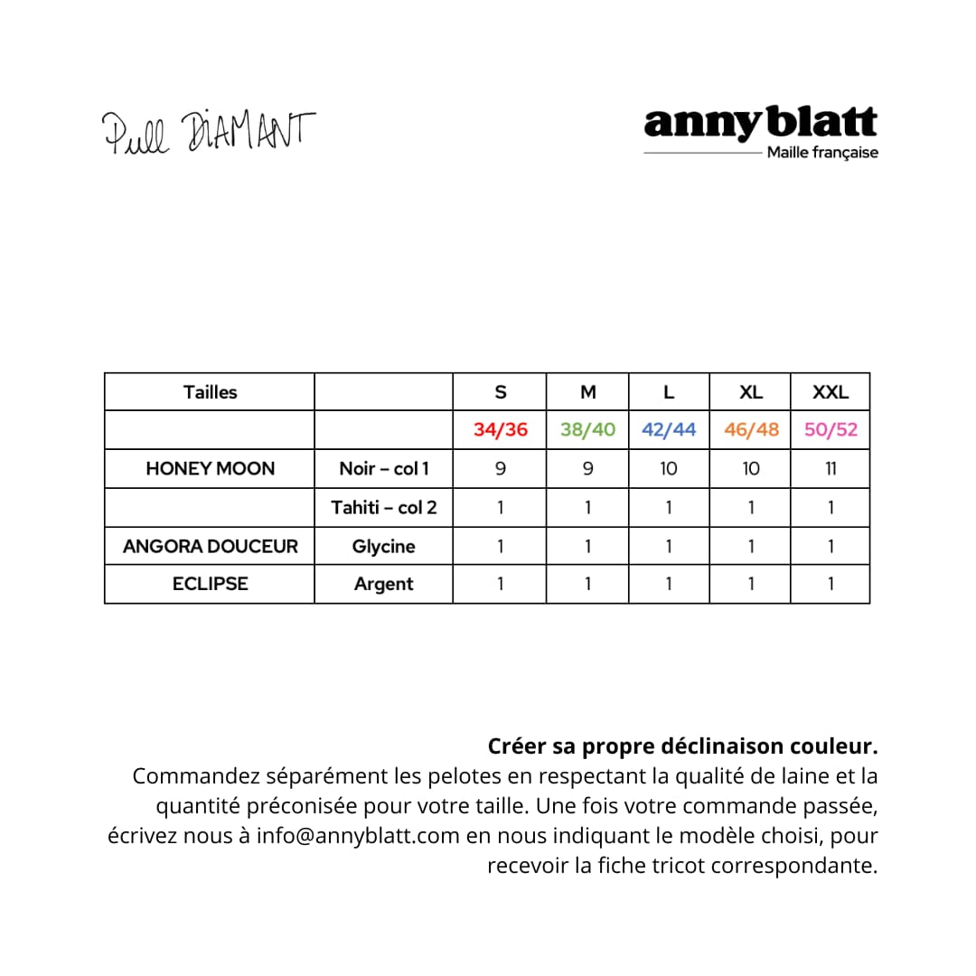 - XL = 11 pelotes Honey Moon, 1 Eclipse et 1 Angora Douceur