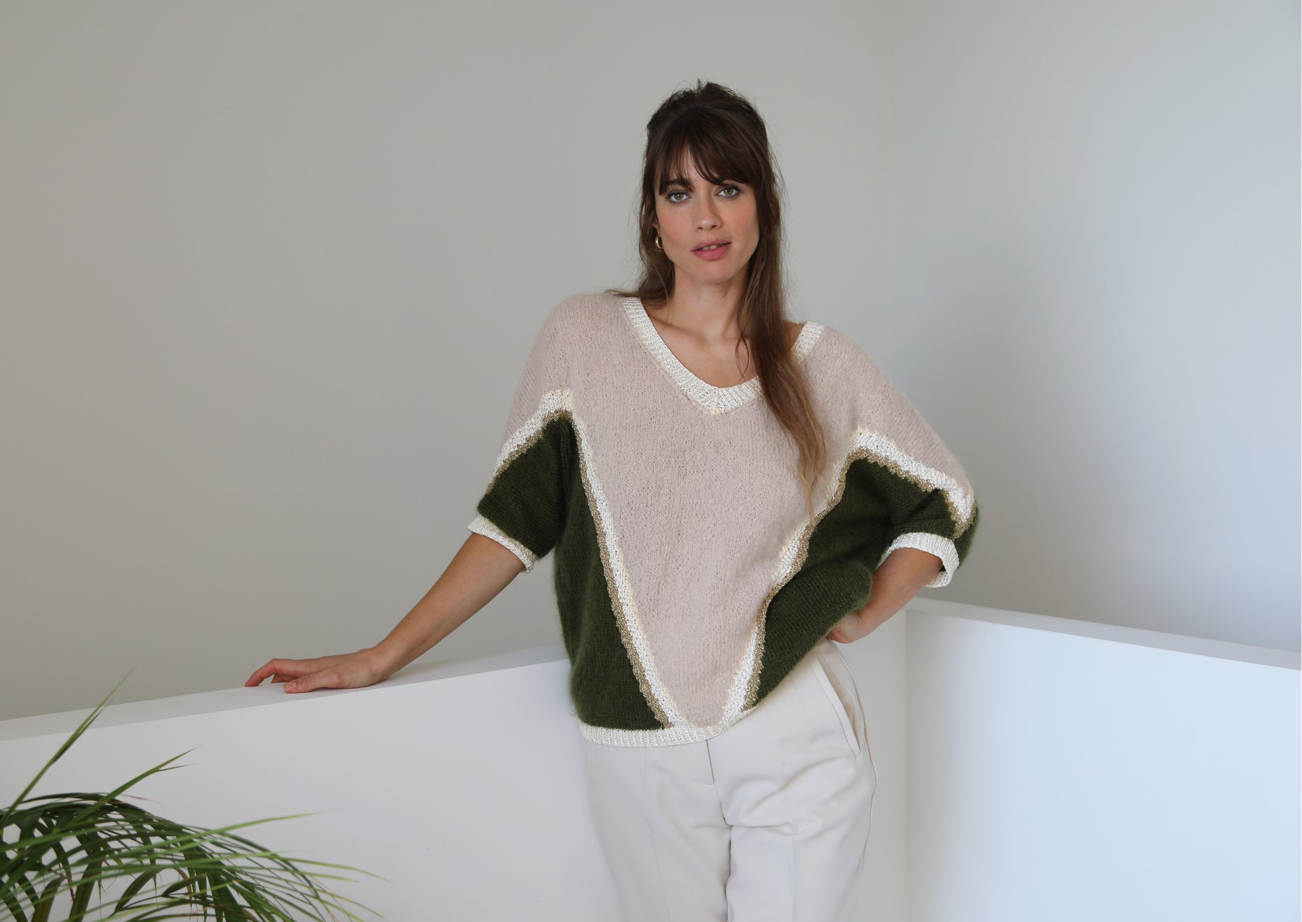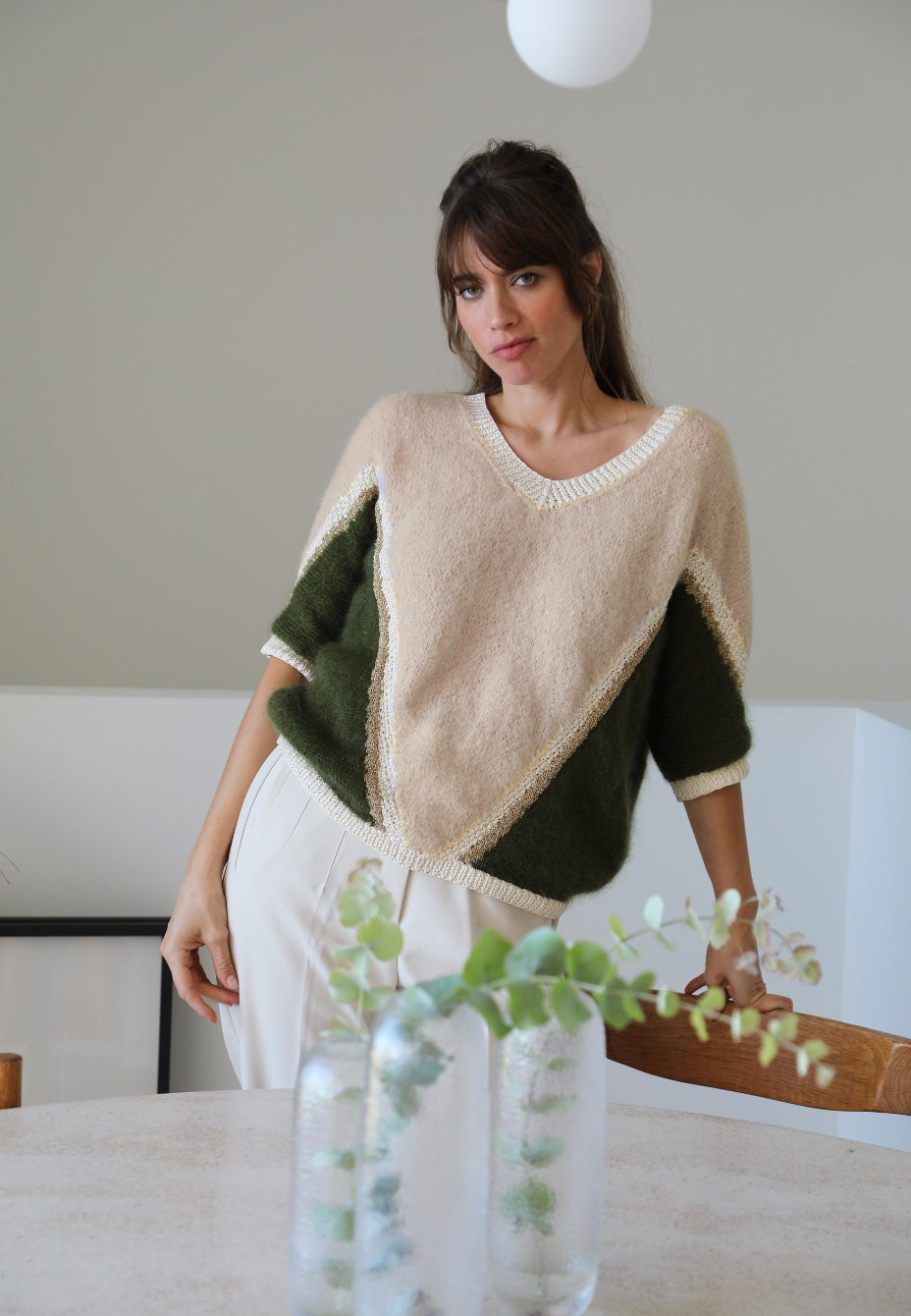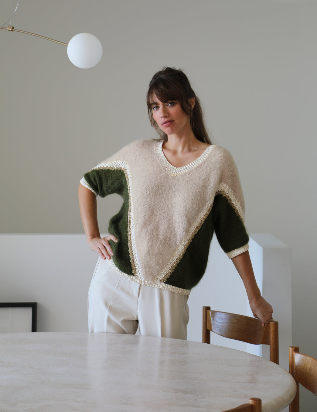Estelle est un pull de caractère qu'on adore pour son motif symétrique graphique élégant. On aime ses manches courtes et sa forme ample car le style ne doit pas empiéter sur le confort.