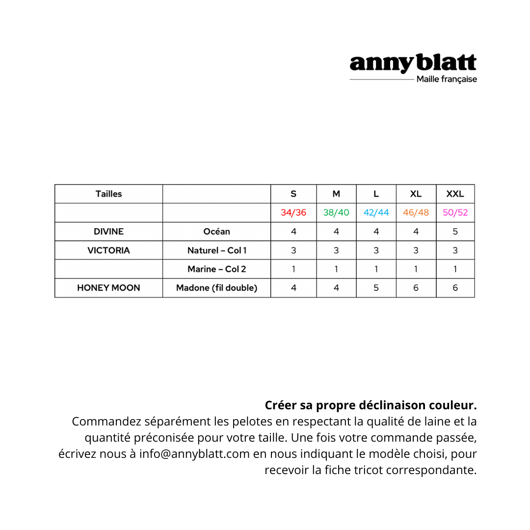 - XL = 4 pelotes de Divine, 4 de Victoria et 6 de Honey Moon
