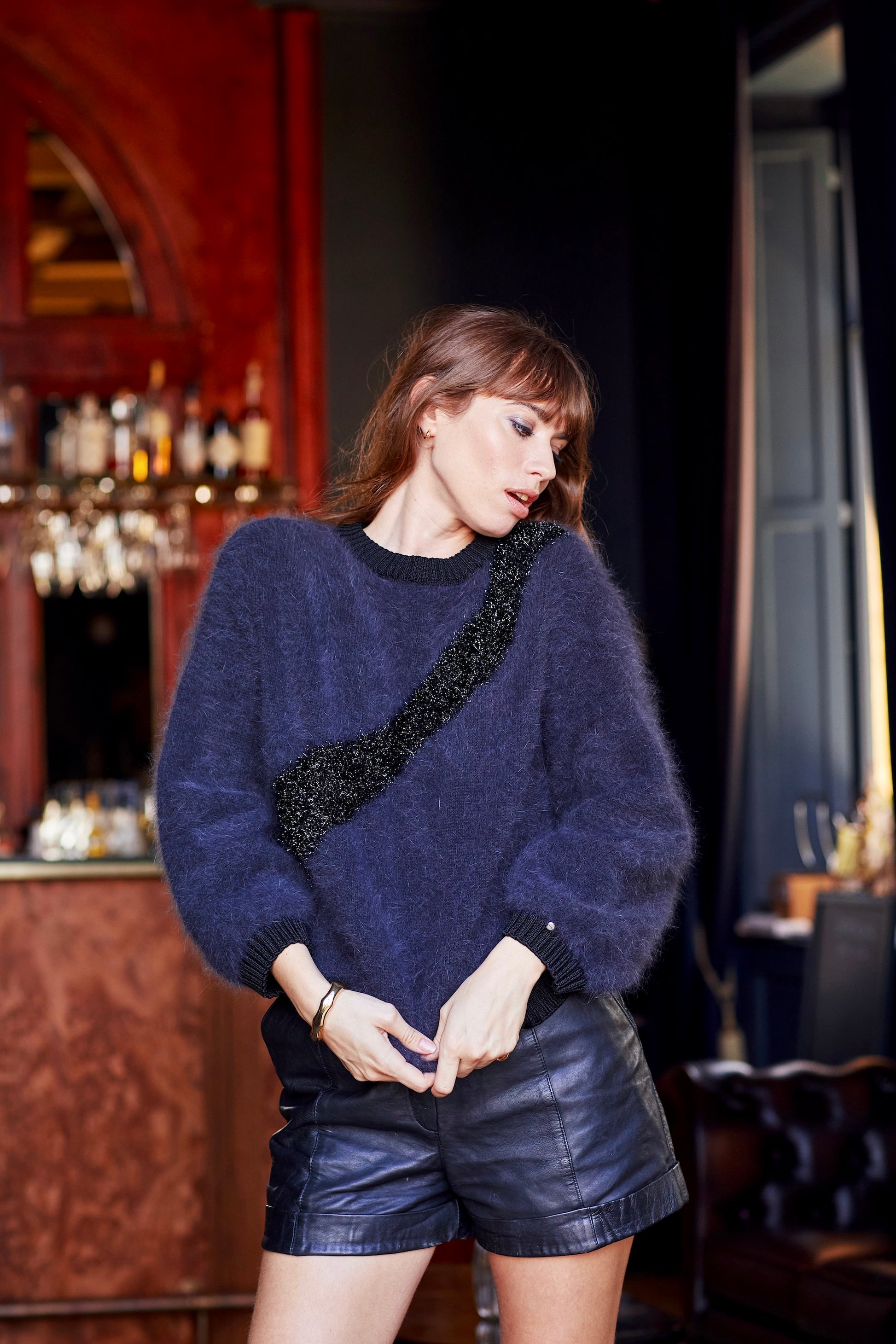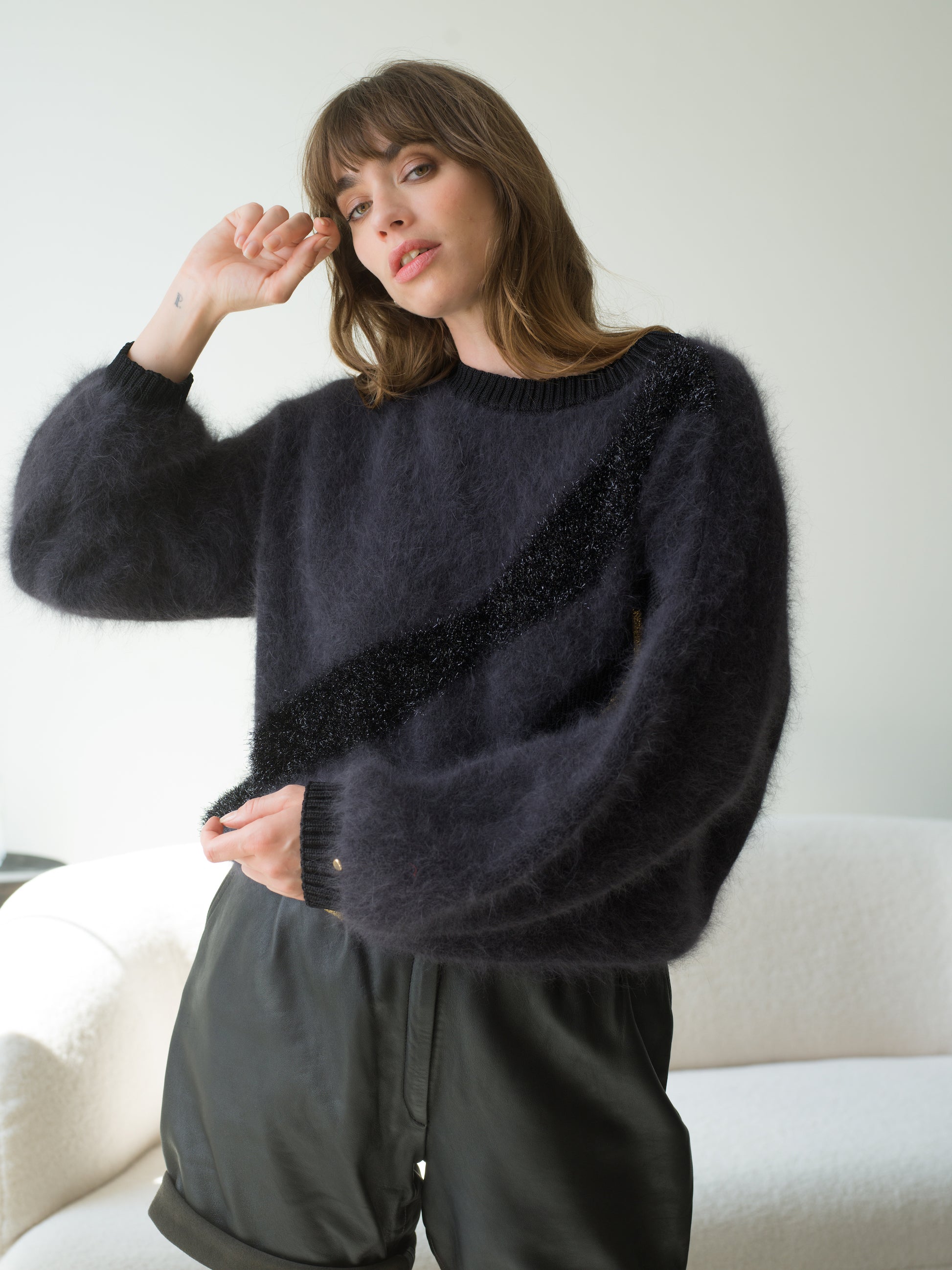 Laissez-vous séduire par la subtile harmonie de matières et de couleurs de ce pull grâce au jeu de contrastes entre le noir anthracite de l'Angora, le noir profond de l'encolure et des poignets et le noir brillant de la bande asymétrique sur le devant.