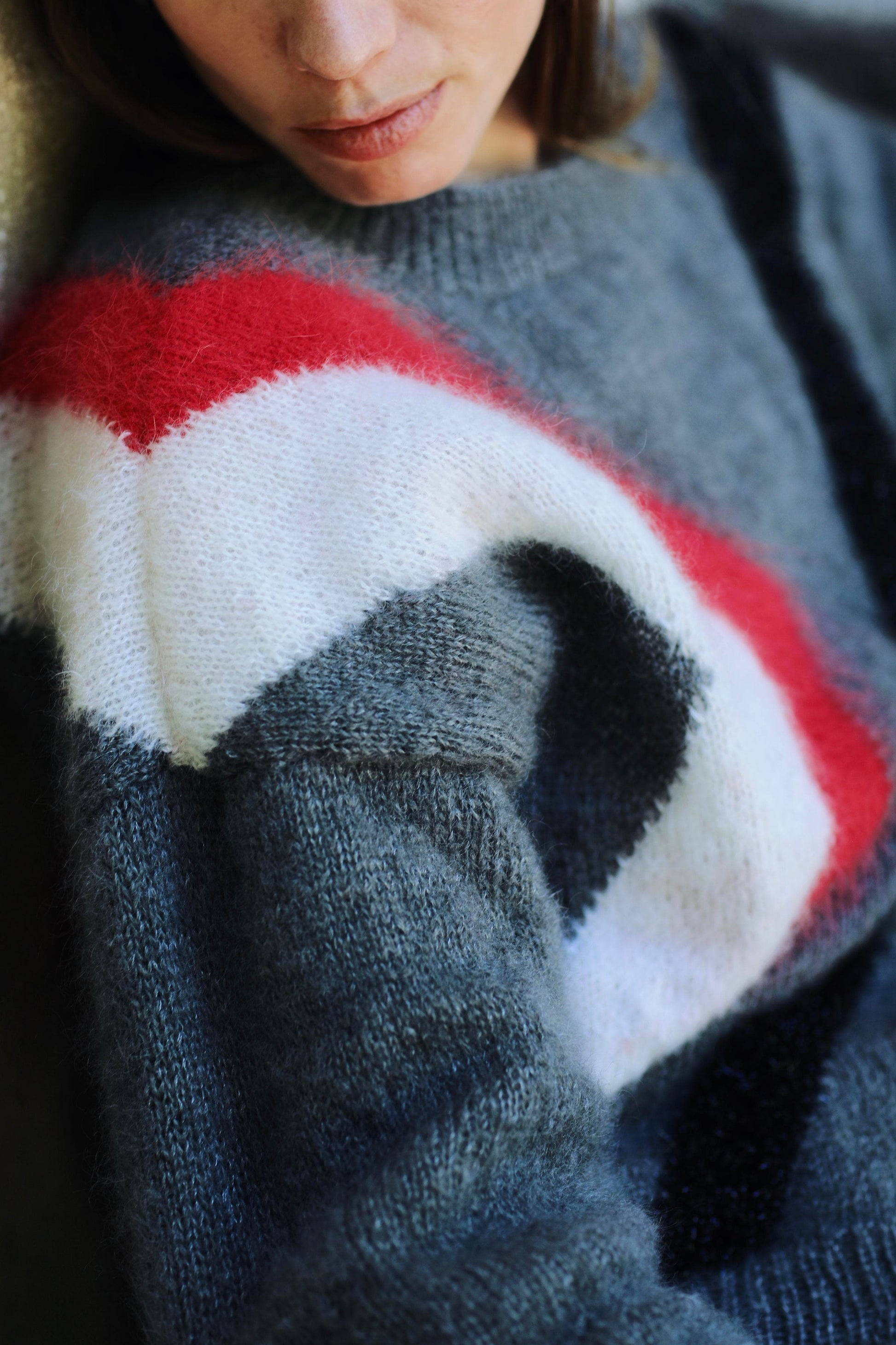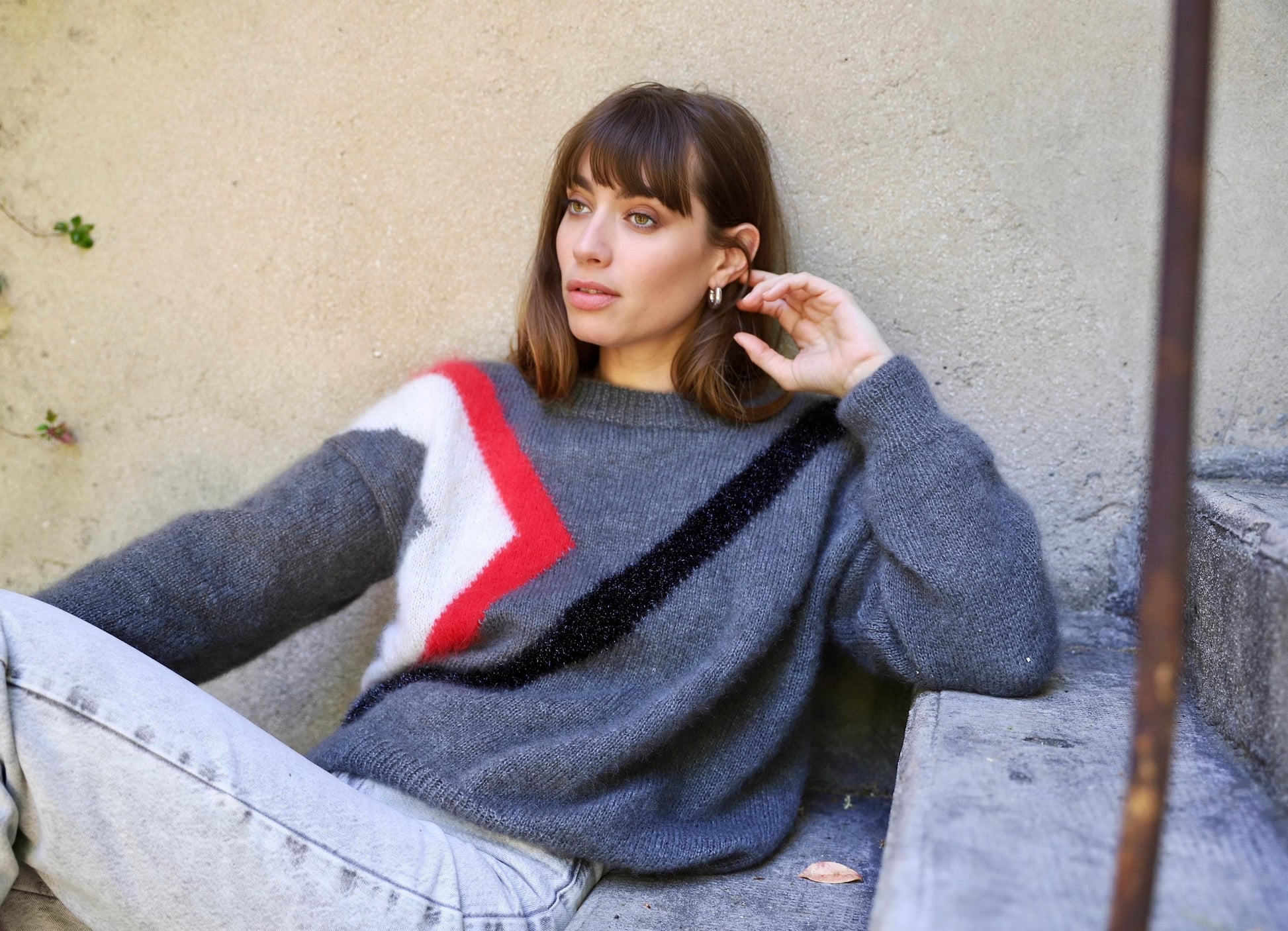 Le mélange de matières entre les différentes bandes du motif apporte une dimension nouvelle à ce modèle à tricoter. On joue sur le volume et le poilu de l’Angora d'un côté et de l'autre, sur les reflets brillants générés par le fil fantaisie Muguet.