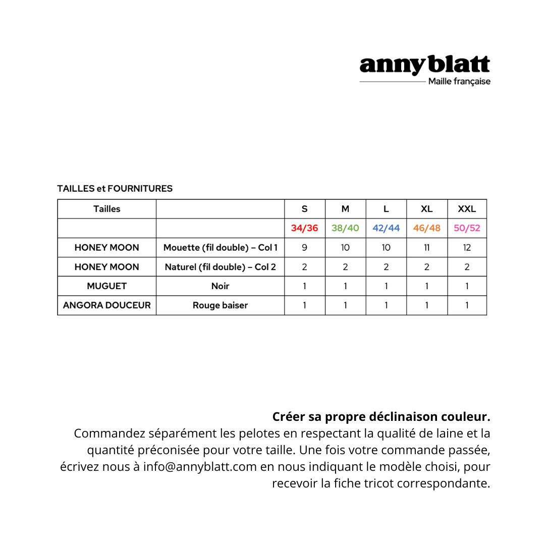 - XL = 13 pelotes de Honey Moon, 1 d'Angora Douceur et 1 de Muguet