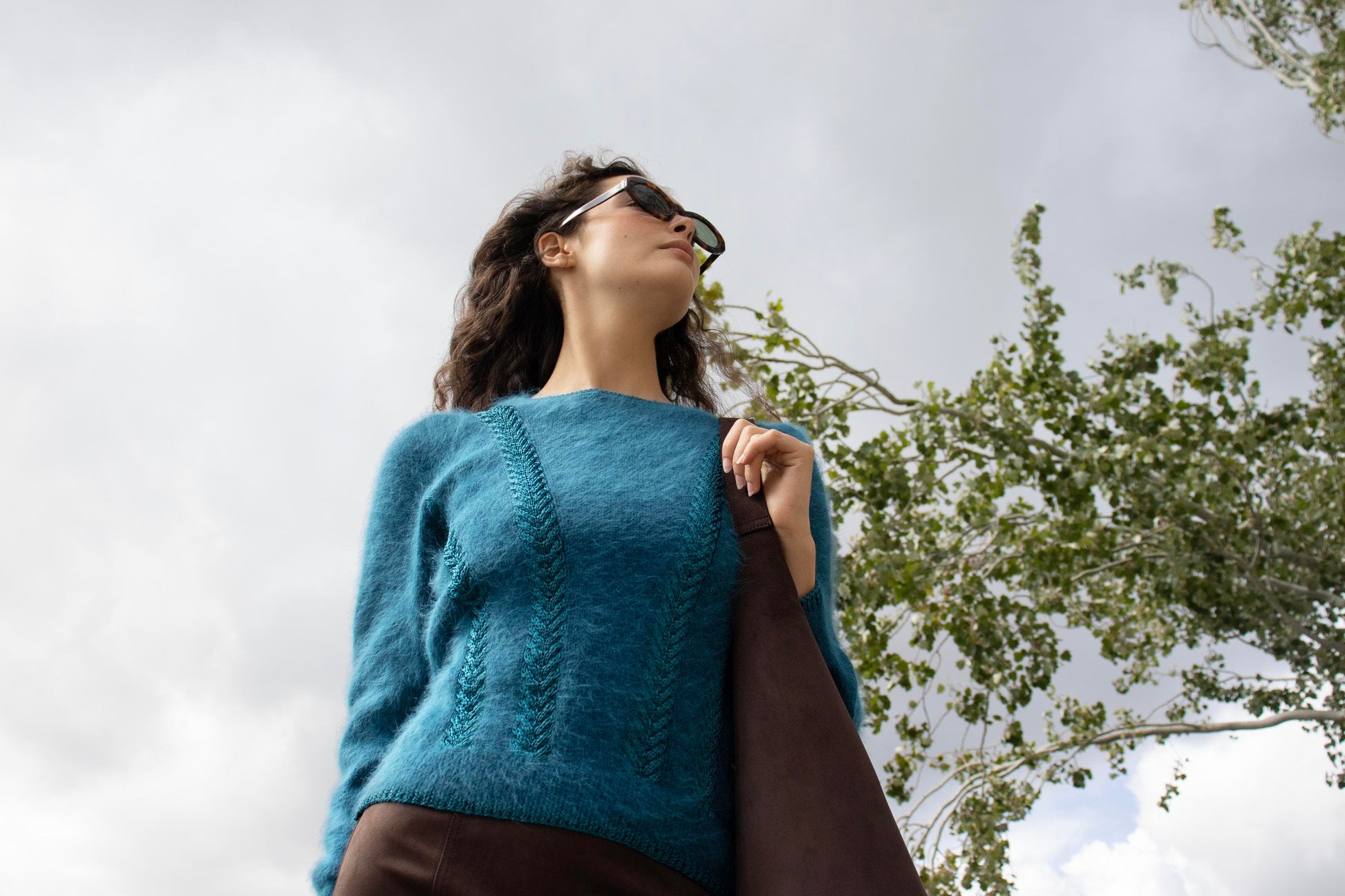 Le corps de ce pull assez ajusté se réalise avec notre emblématique Angora Douceur : une laine made in France 100% naturelle ! Son rendu poilu, telle une fourrure, est sublimé par 2 torsades satinées qui soulignent la taille et donnent de l'élan à la silhouette.