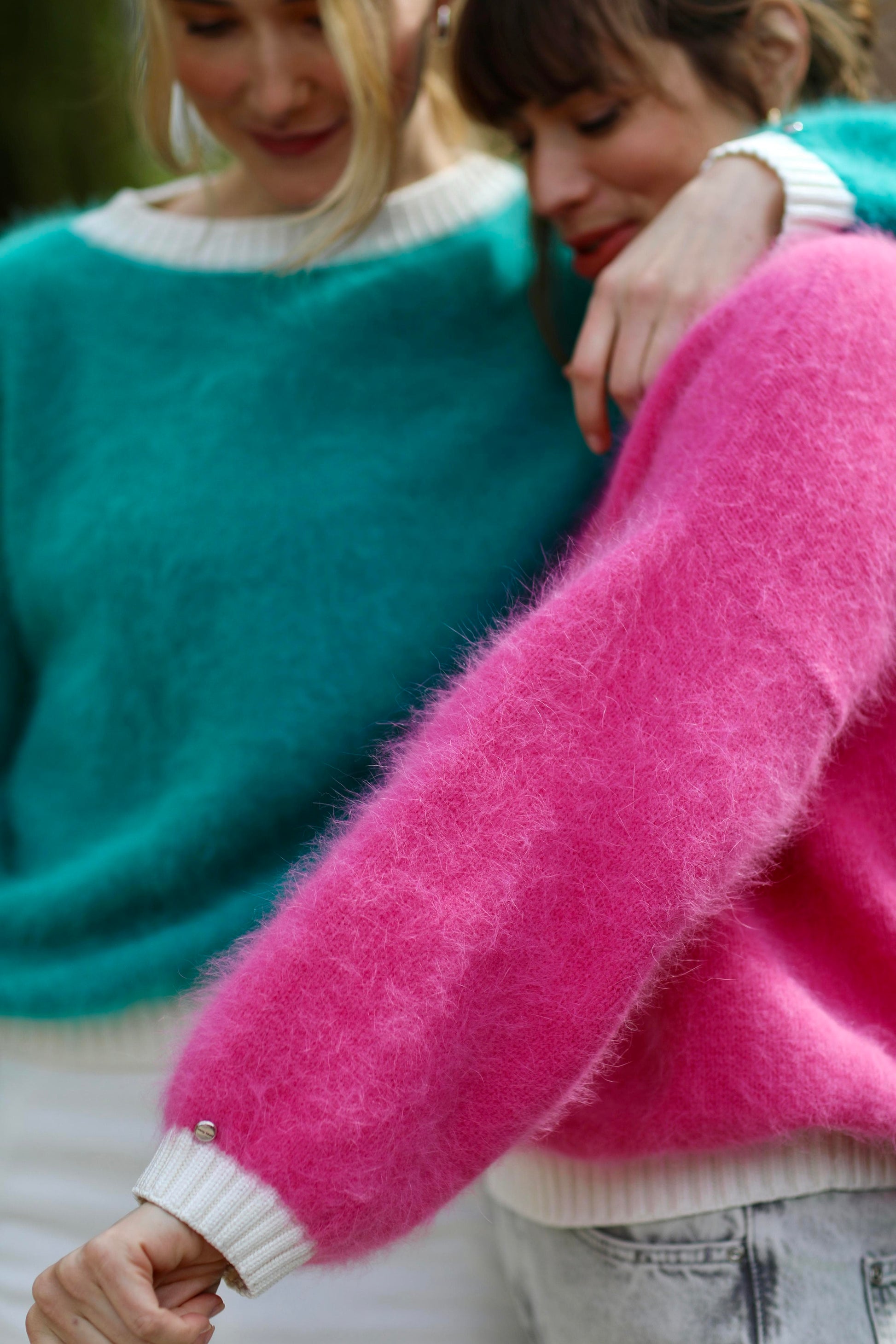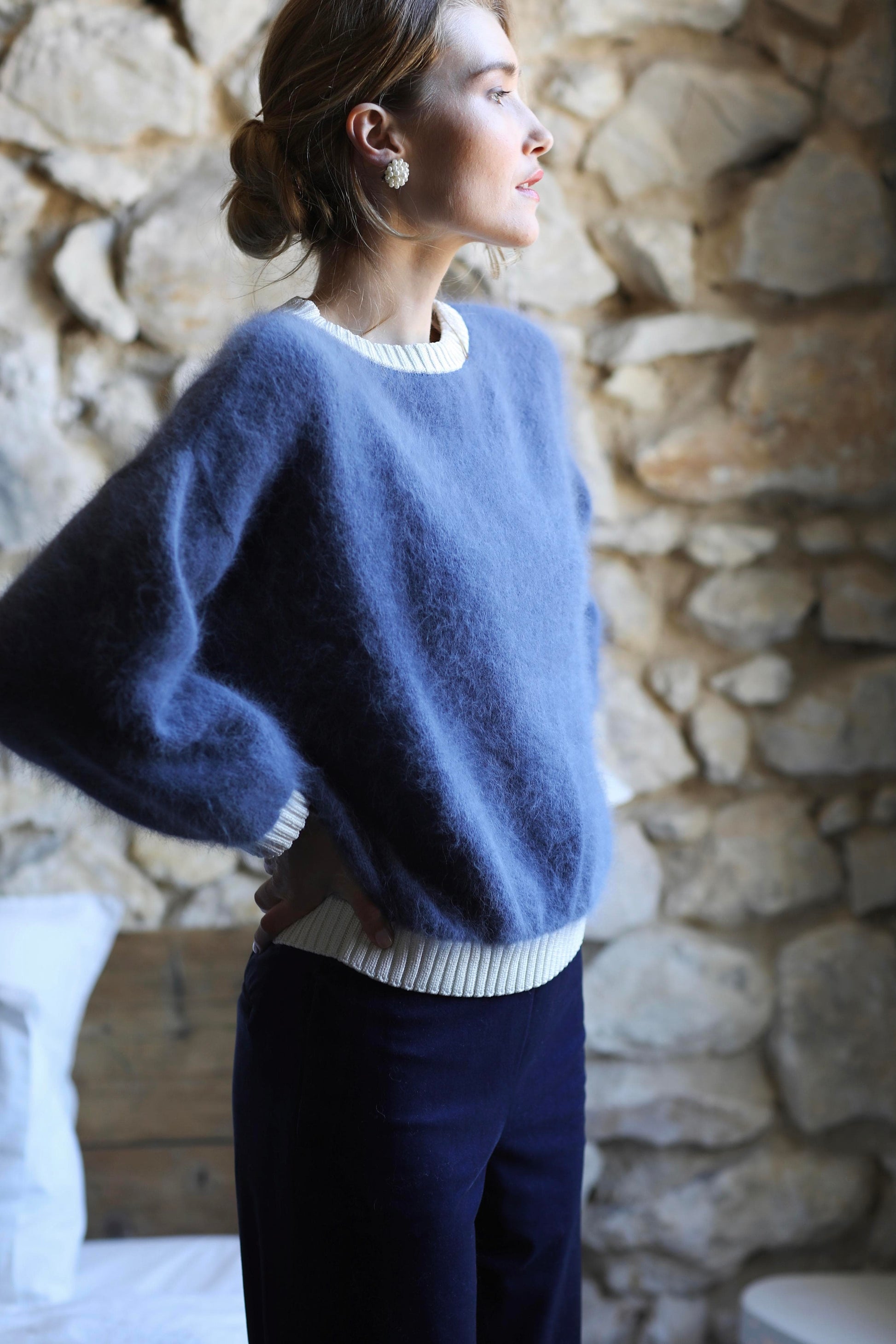 L'aspect fourrure unique du pull Mila est obtenu grâce à notre fil emblématique Angora Douceur. Ce fil inimitable, composé de poil de lapins élevés avec amour dans l'ouest de la France et de laine, confère au pull une douceur et une chaleur incomparables.