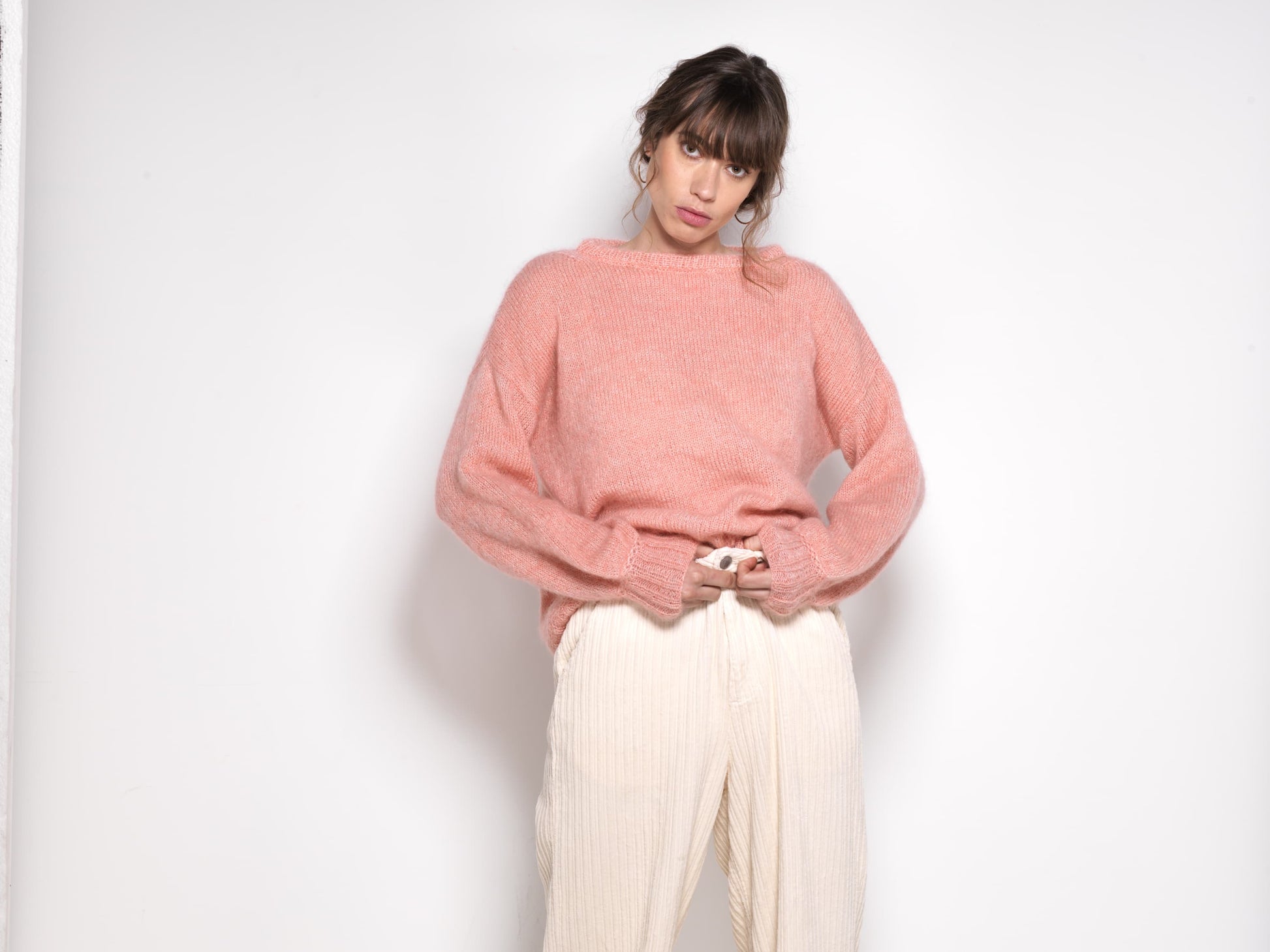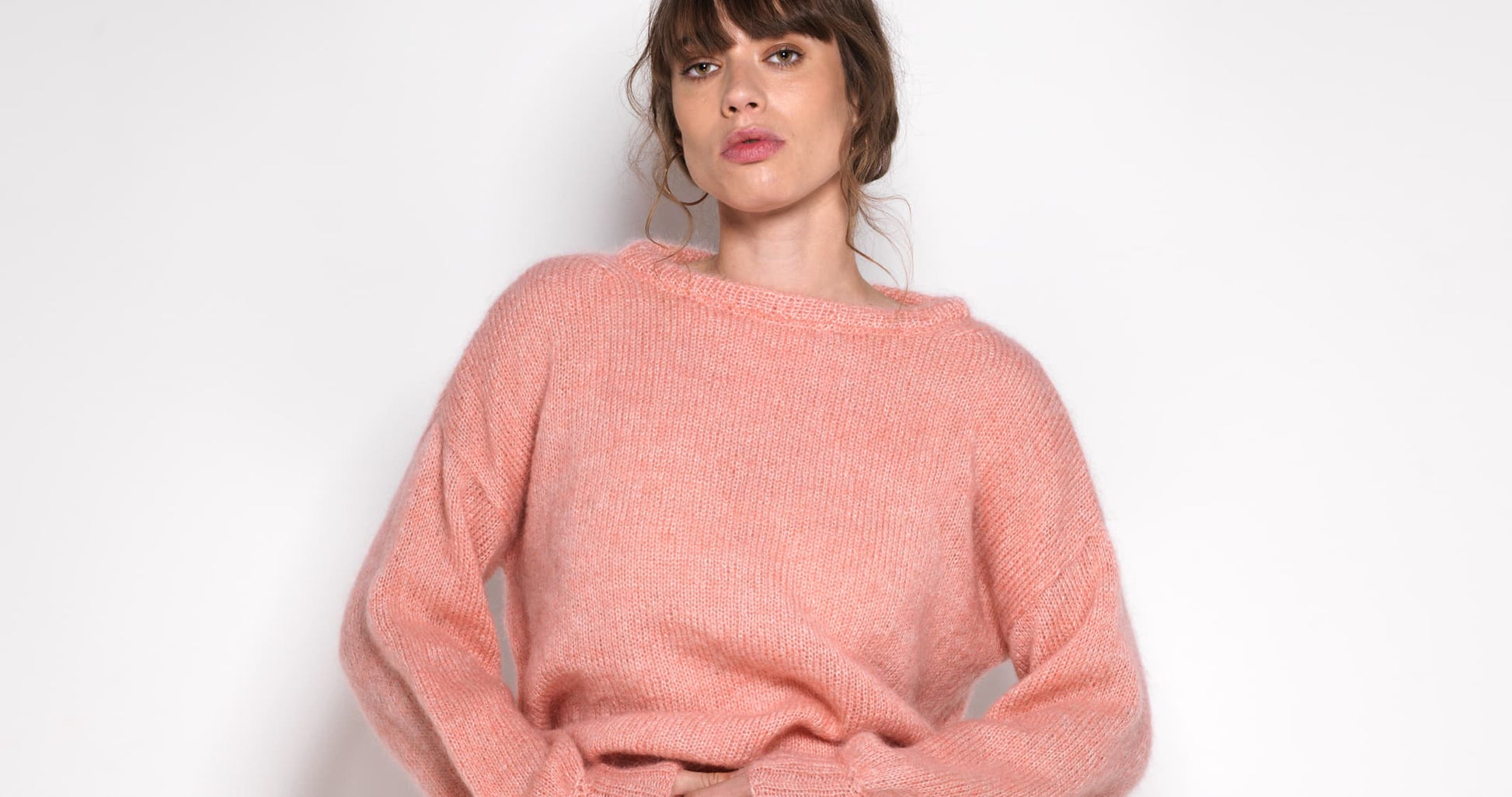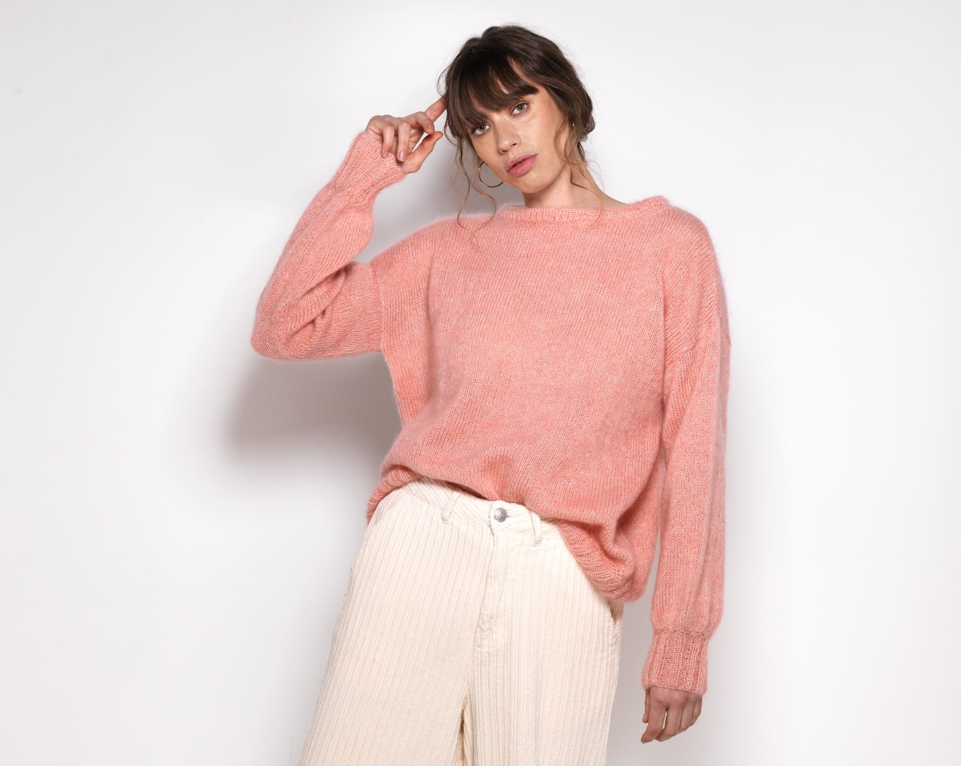 Ainsi, le pull Agate est tricoté en 2 fils mélangés, le fil Sirius irisé associé au fil Honey moon, notre fil précieux en super kid mohair et soie. L'association de ces 2 fils lui confère ses couleurs uniques à l'image de ce rose bonbon.