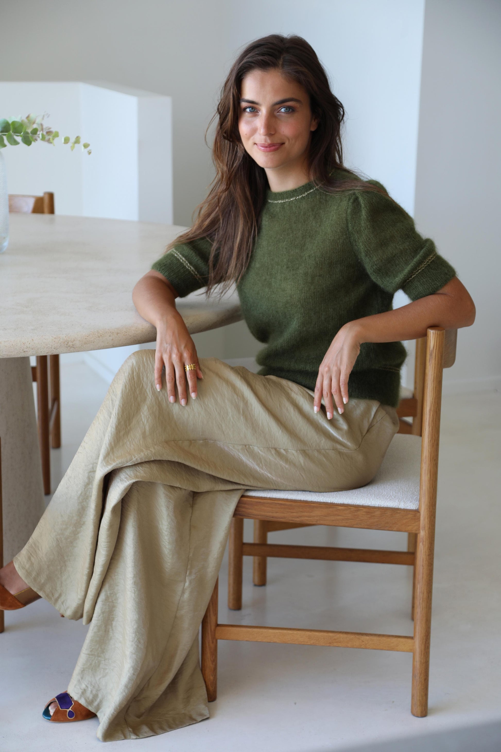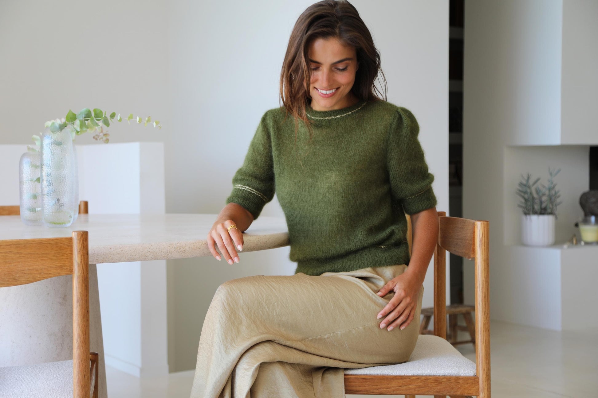 Un pull facile à enfiler confortable et élégant : sa forme est ajustée juste ce qu'il faut, ses sont épaules légèrement froncées et les bordures sont soulignées par quelques rangées très fines de fil brillant.