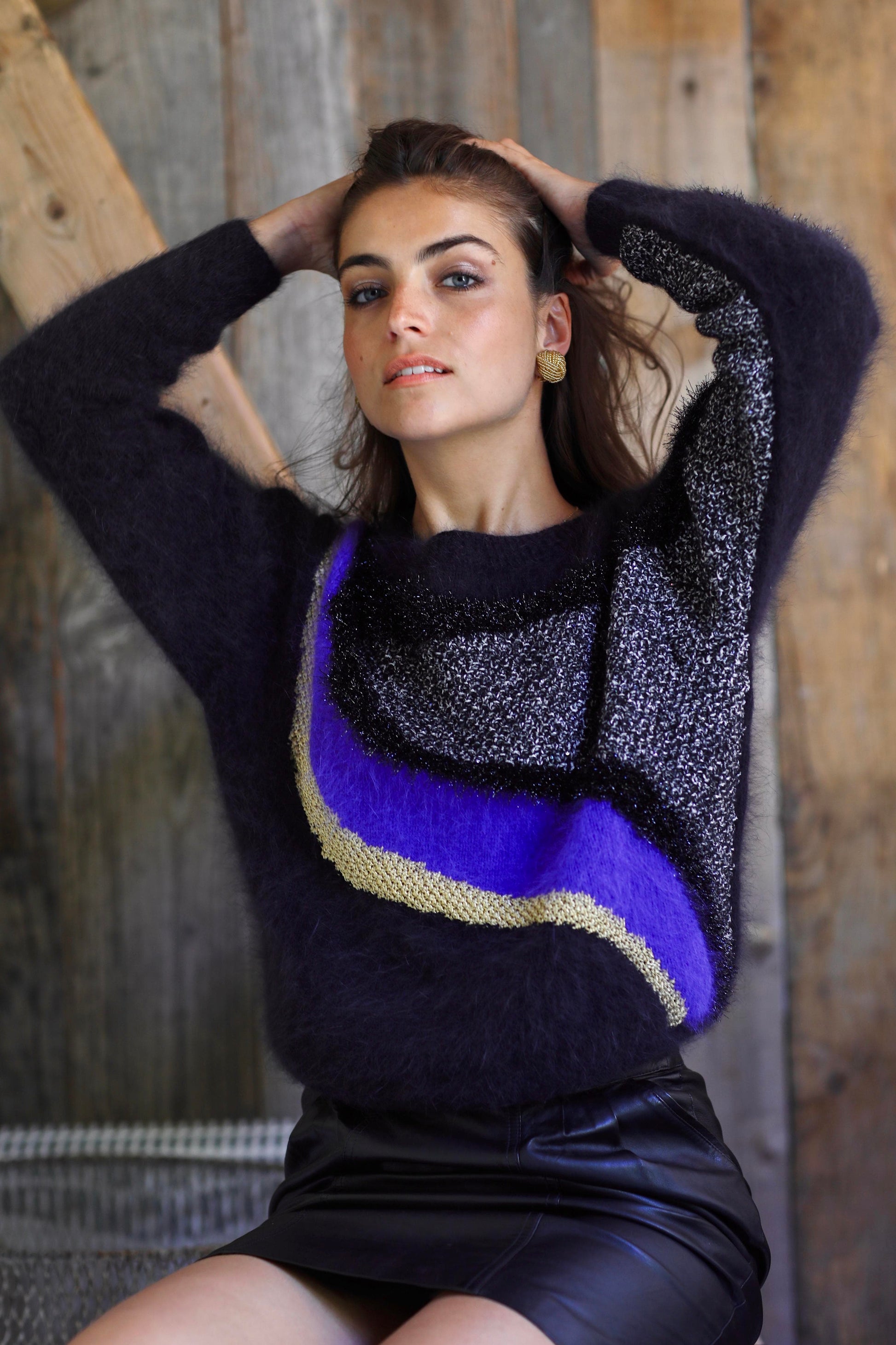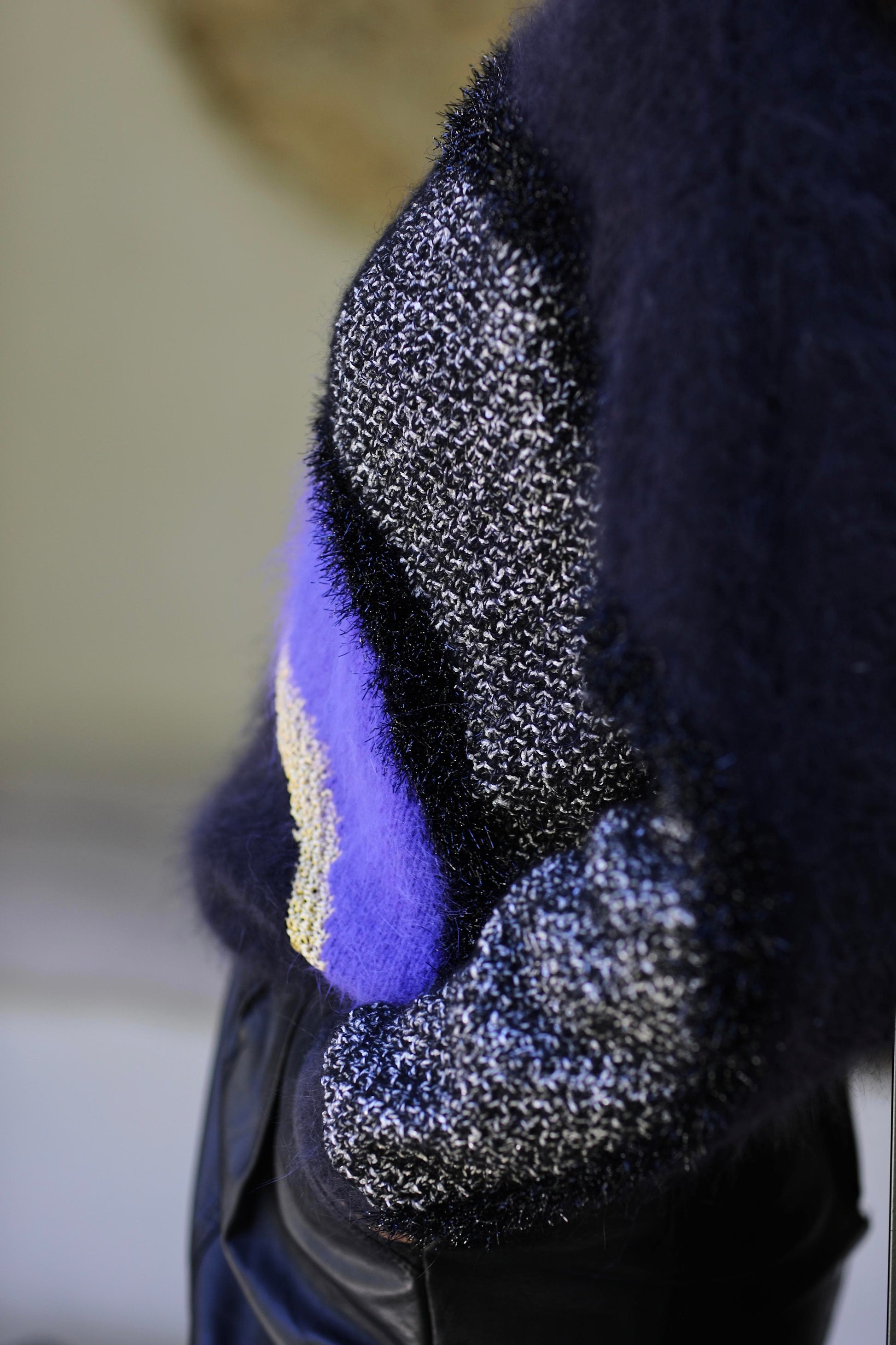 - Fil Angora Douceur 50% Angora français, 50% laine mérinos travaillé en jacquard intarsia avec des fils fantaisies