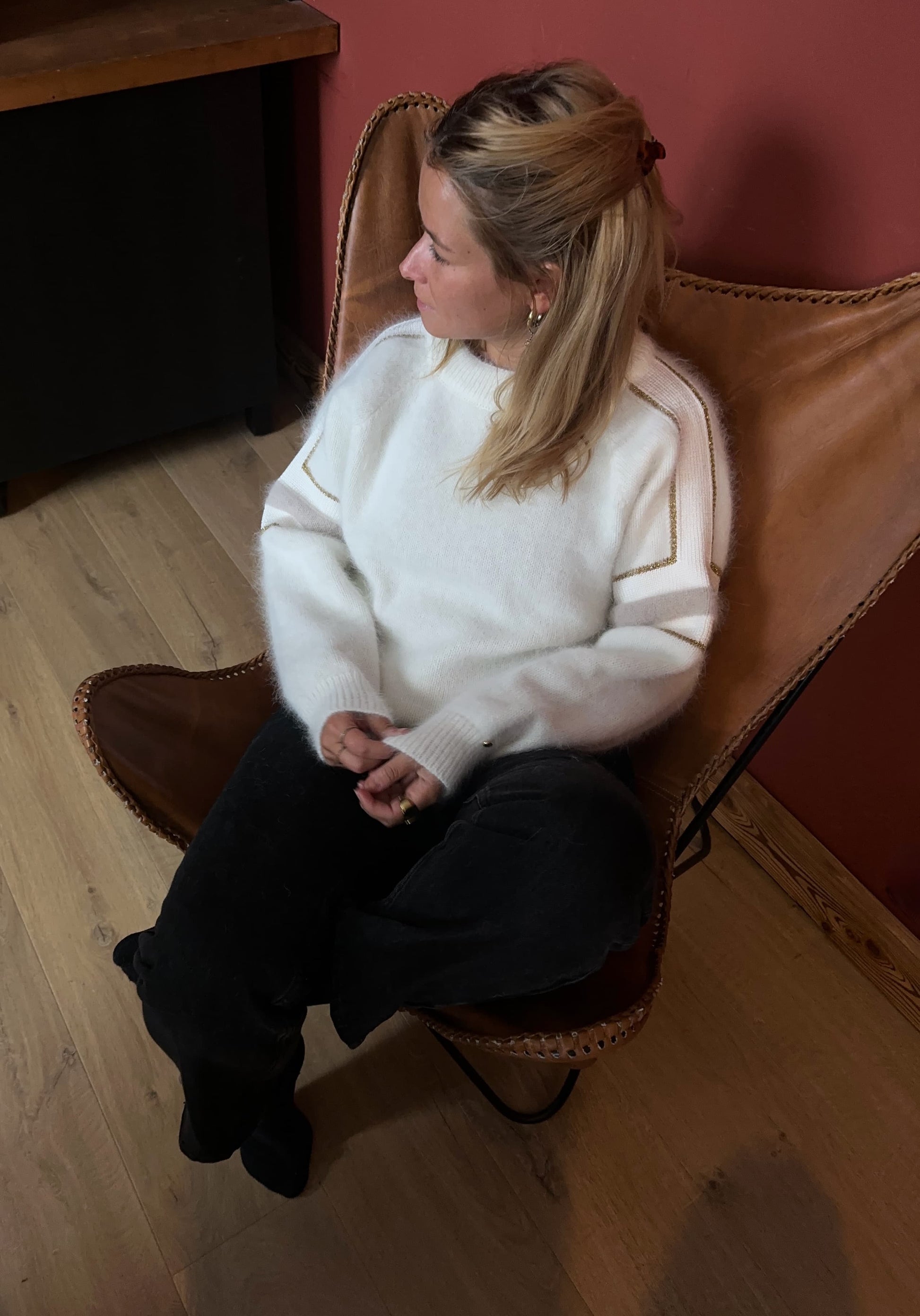 Notre fil français Angora Douceur (50% Angora/50% Mérinos) compose majoritairement ce pull.
