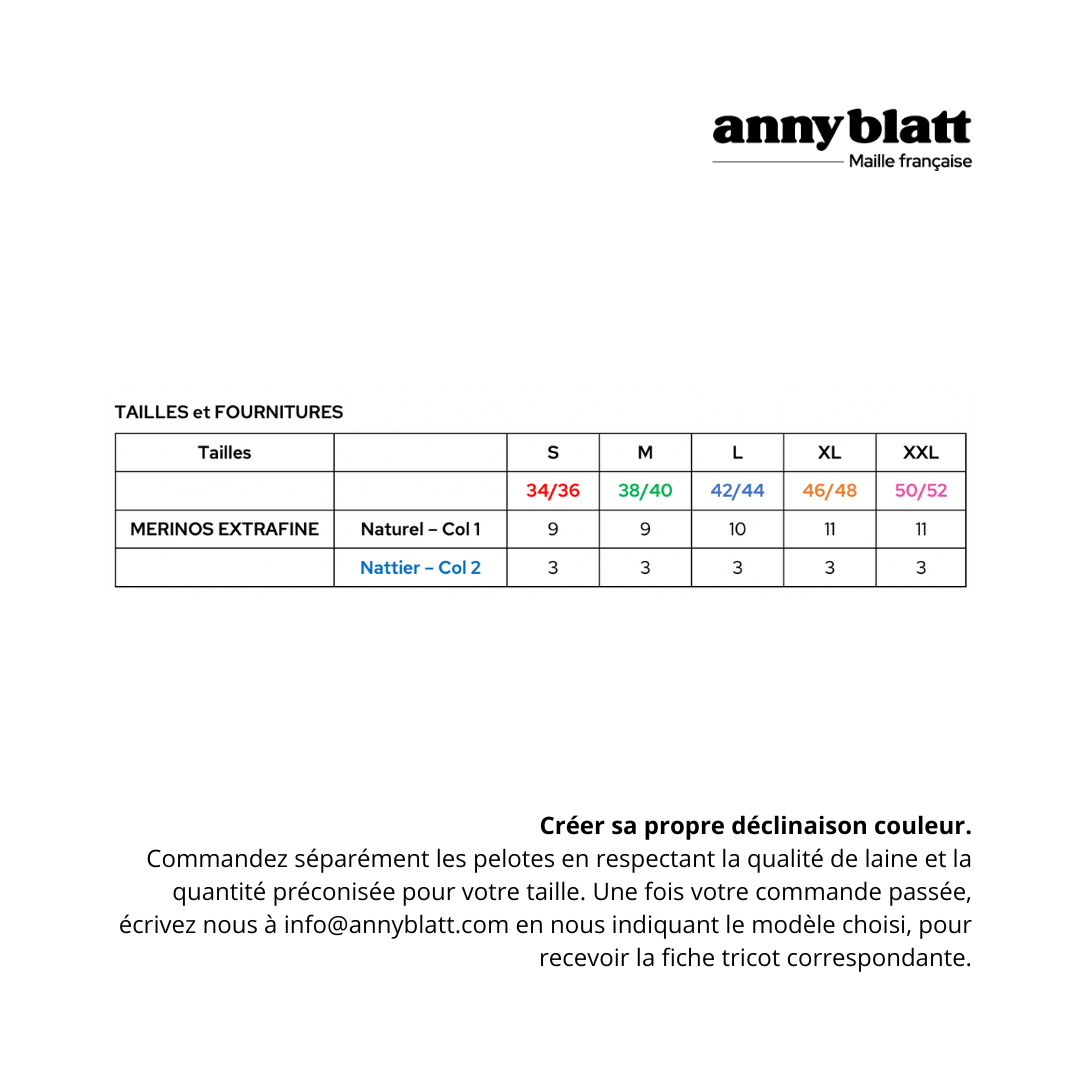 - Aiguilles n° 3.5 et n°4, aiguilles circulaires n°3.5 (ou aiguilles à doubles pointes) et 6 boutons décoratifs T20 (non fournis)