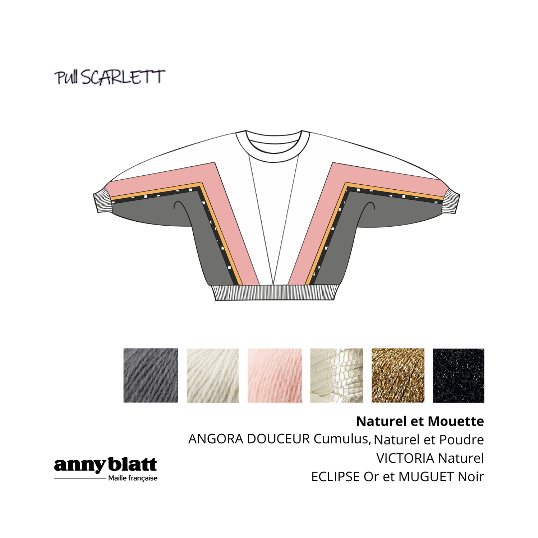 Ce qui distingue le pull Scarlett, c'est son plastron profond sur le devant, réalisé avec le fil ruban satiné Victoria. Ce détail soigneusement travaillé au point de riz offre un superbe "décolleté" qui mettra en valeur votre silhouette avec élégance et raffinement.