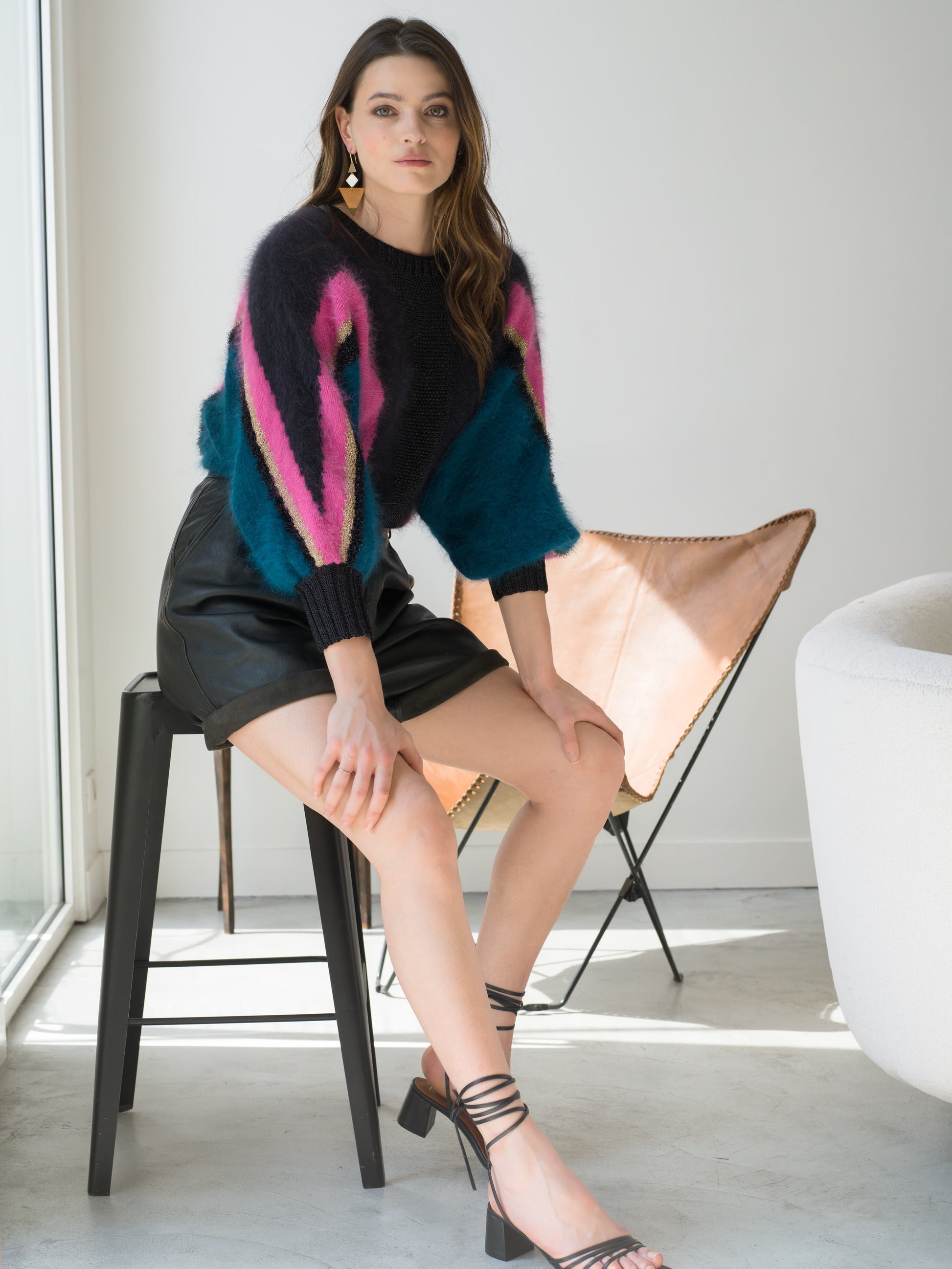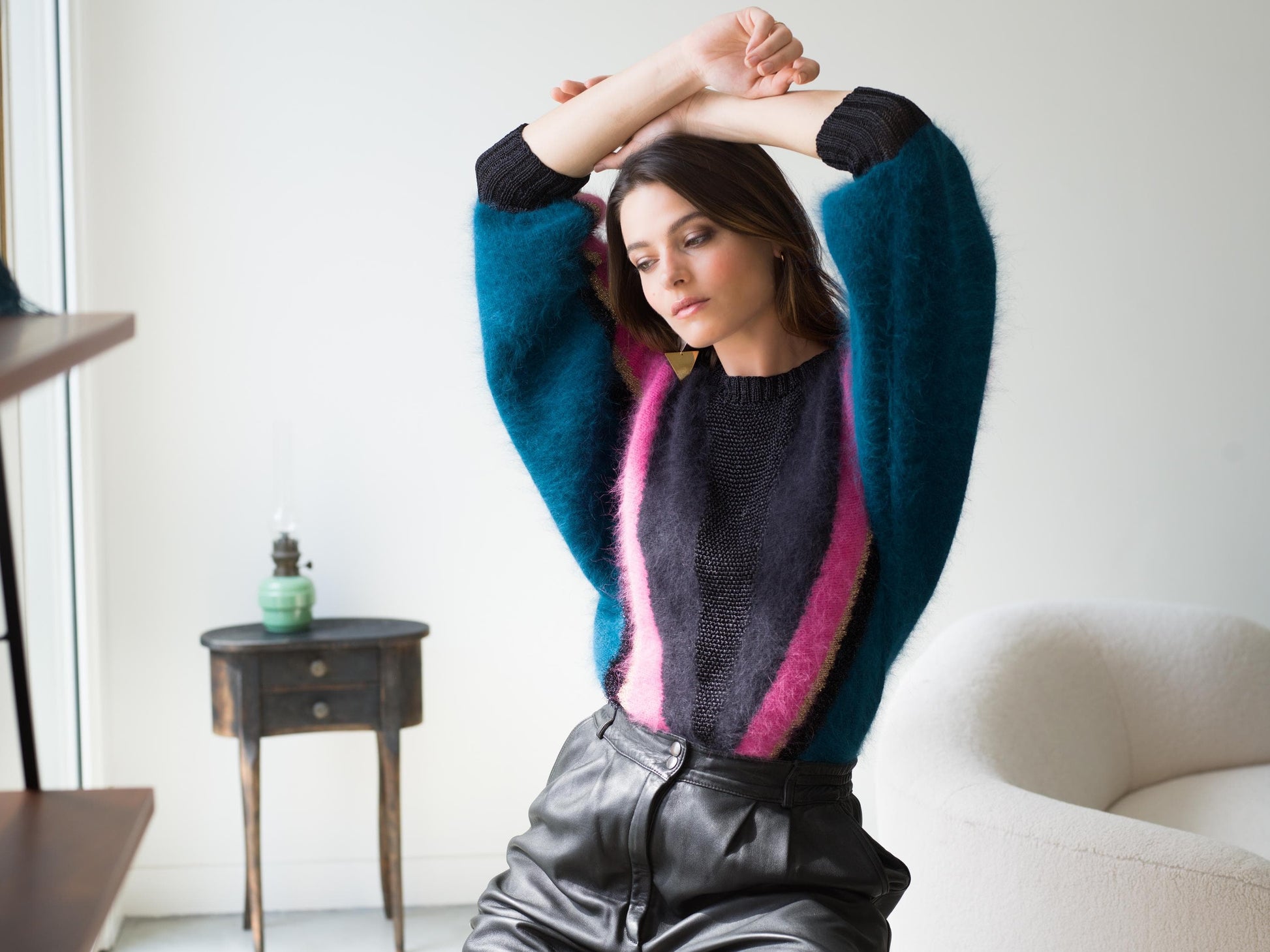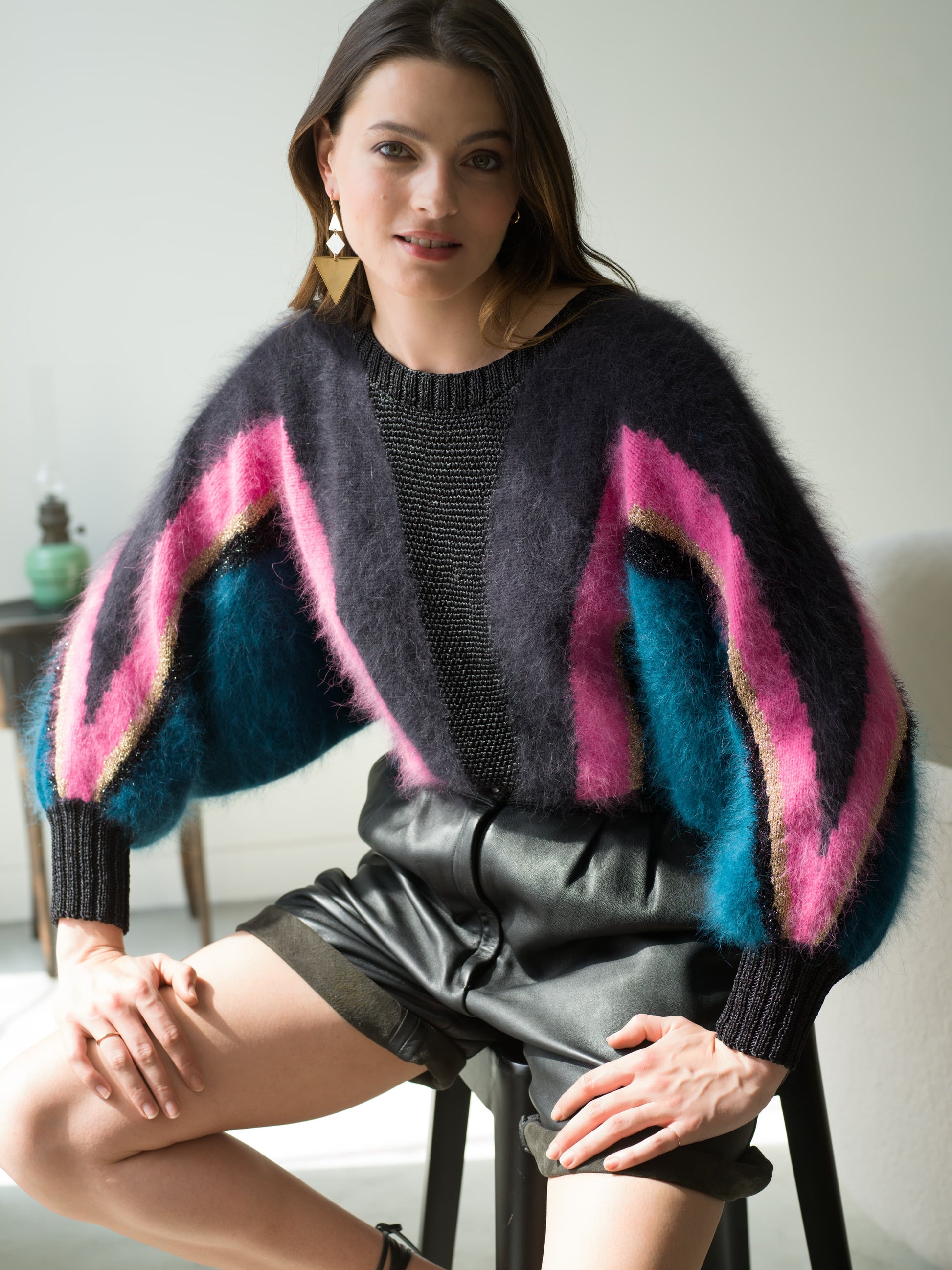 - Fil Angora Douceur 50% Angora français, 50% laine mérinos travaillé en jacquard intarsia avec des fils fantaisies