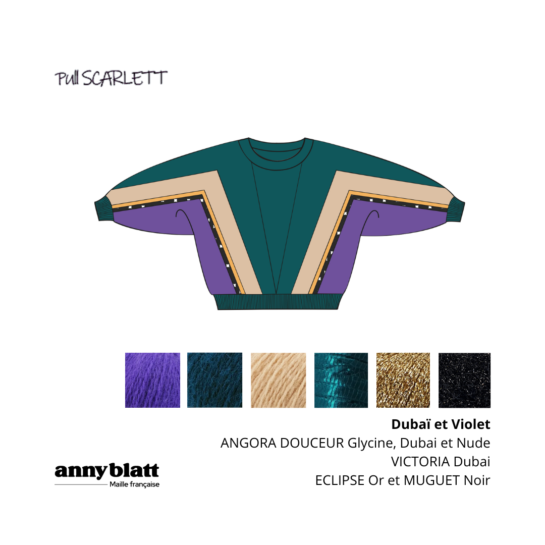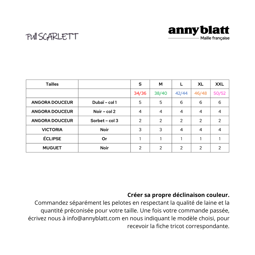Le pull Scarlett est un véritable chef-d'œuvre de tricot, conçu pour les passionné(e)s qui recherchent un projet à la fois stimulant et gratifiant. En suivant une grille intarsia, vous créerez un motif qui mêle habilement le poilu caractéristique et chic de l'Angora avec les fils fantaisie originaux d'Anny Blatt. Le résultat ? Une pièce unique.