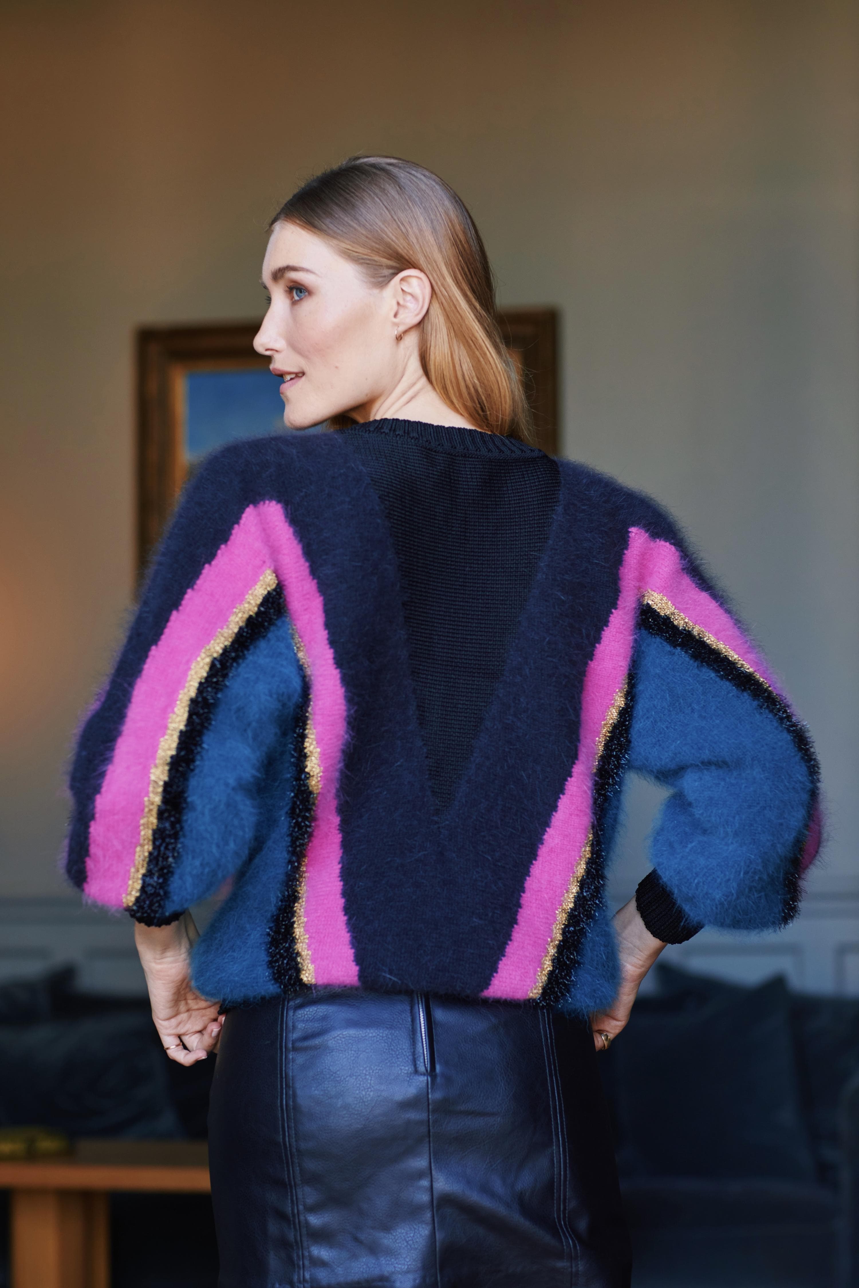 Notre fil Angora Douceur compose majoritairement ce pull. Quelques touches de doré et de viscose.