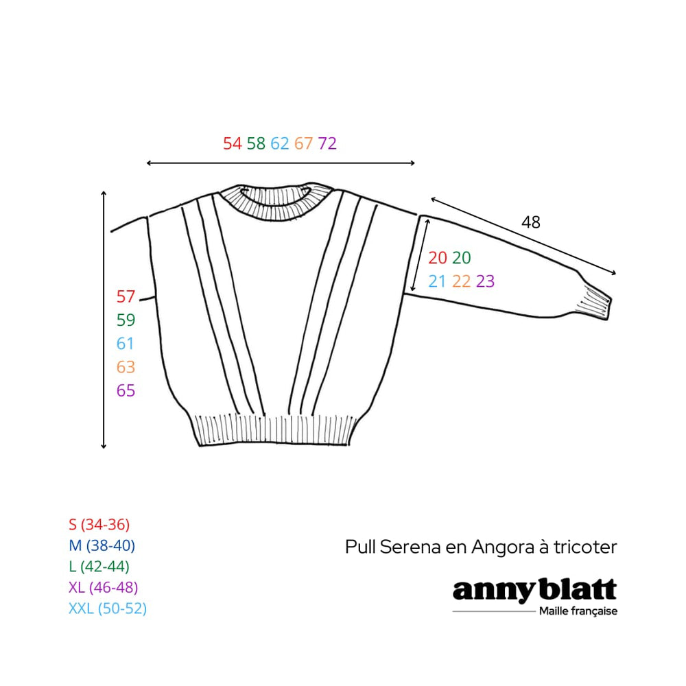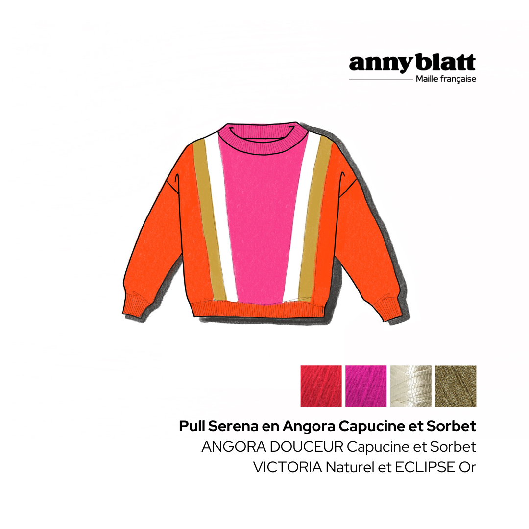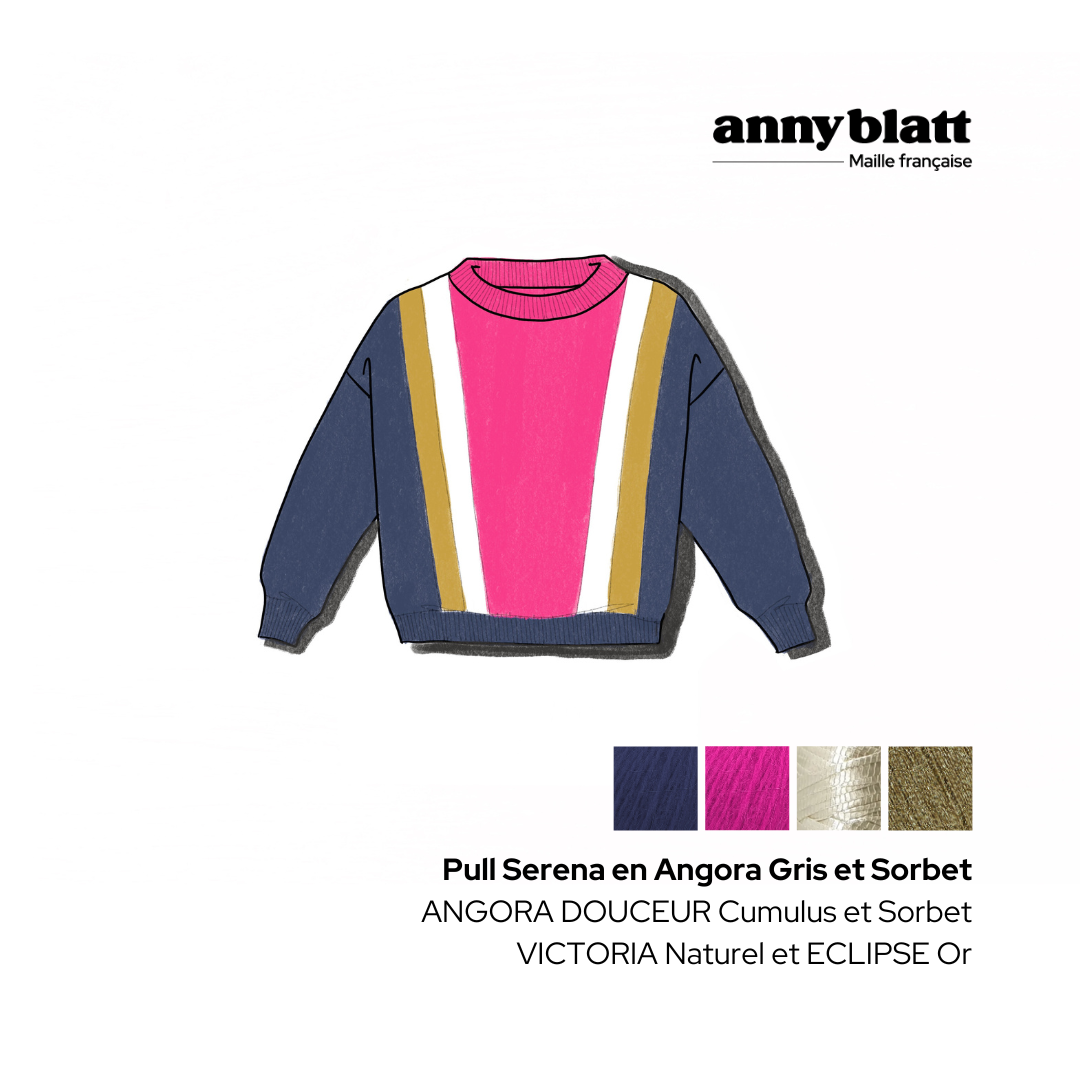 Pas envie de tricoter ? Vous pouvez commander votre pull Serena en Angora [Rose Sorbet](https://www.annyblatt.com/products/pull-serena-en-angora-cumulus-et-sorbet) ou [Violet Glycine](http://www.annyblatt.com/products/pull-serena-en-angora-dubai-et-glycine) en prêt-à-porter. Il sera fabriqué rien que pour vous en France avec une livraison sous 15 jours.