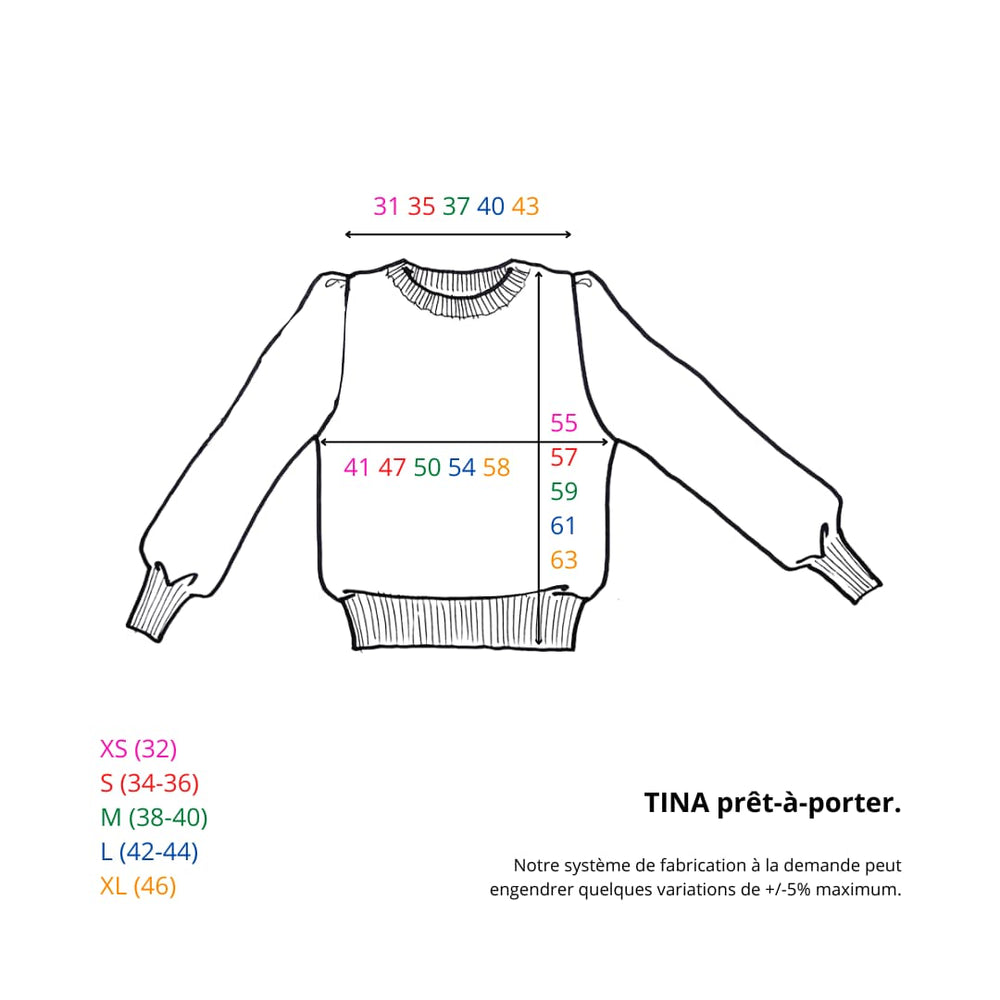 Comme si cela ne suffisait pas, le pull Tina est fabriqué entièrement en France. Depuis le début de l'aventure, nous faisons le choix de produire l'intégralité de nos pulls localement. Ce modèle ne fait pas exception et est en plus tricoté avec un fil fabriqué localement : un sans faute !