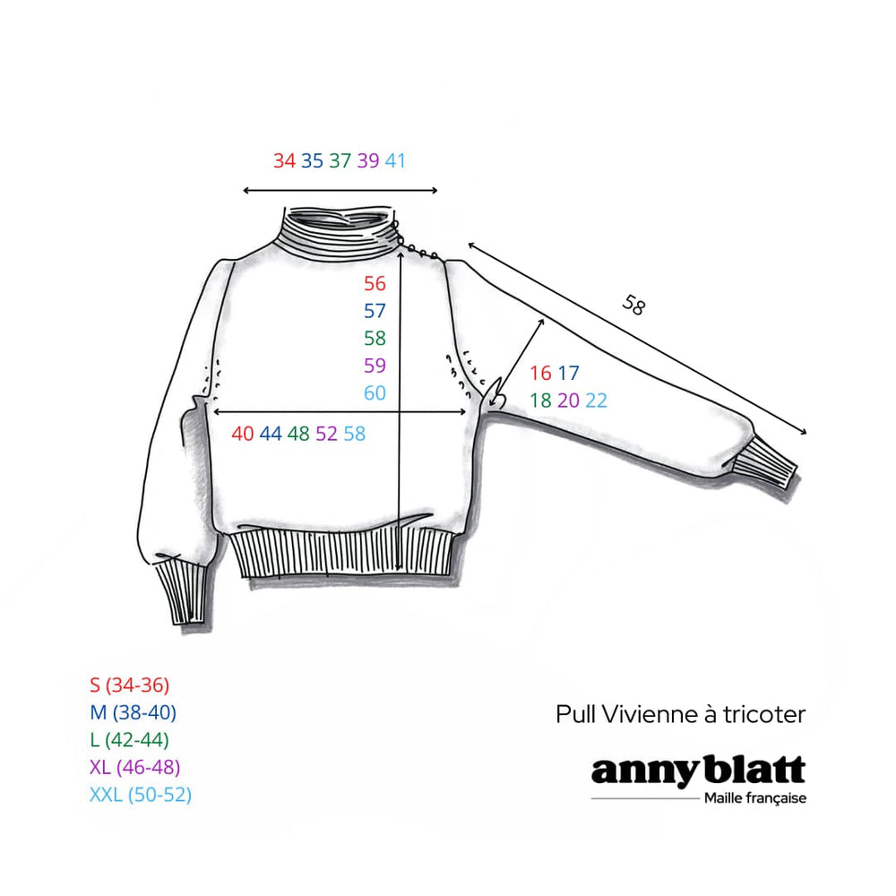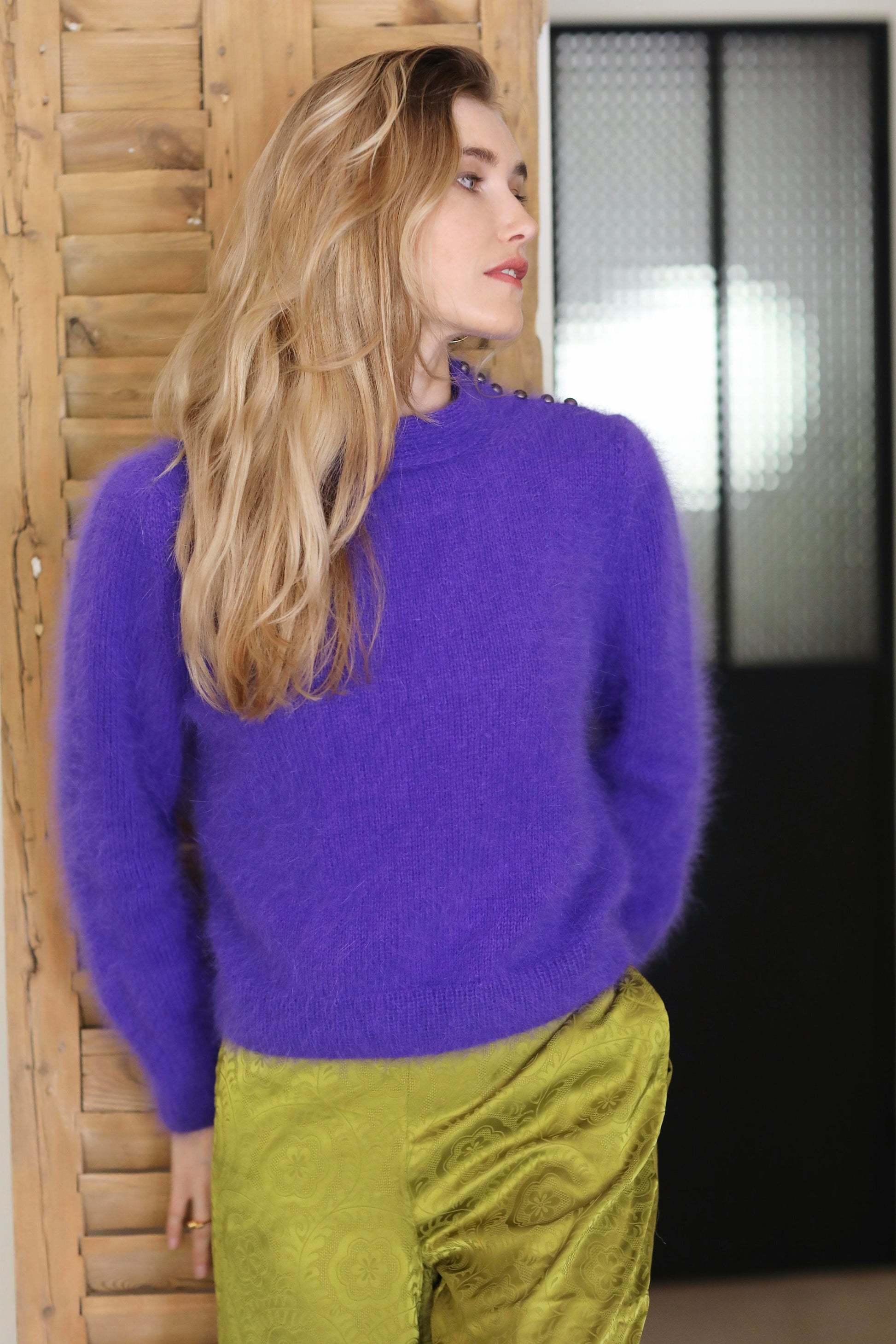 Il se tricote en jersey endroit, à plat. L'encolure légèrement montante a été imaginée par Anne pour offrir à cet intemporel en Angora une touche sophistiquée. Cette bande se tricote en côtes 1/1 et le pull se ferme avec une fine rangée de boutons sur l'épaule.