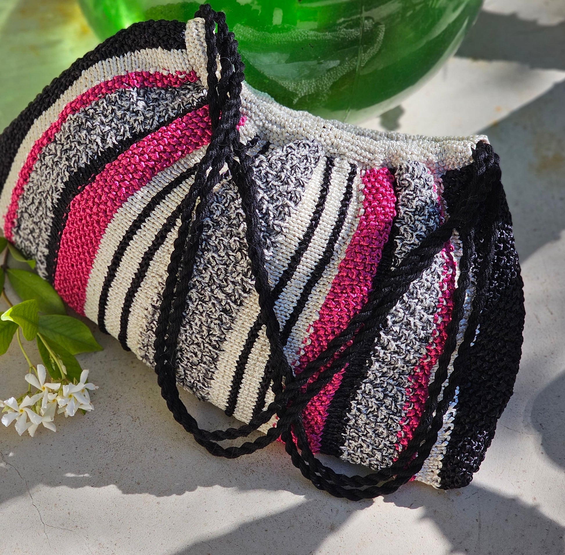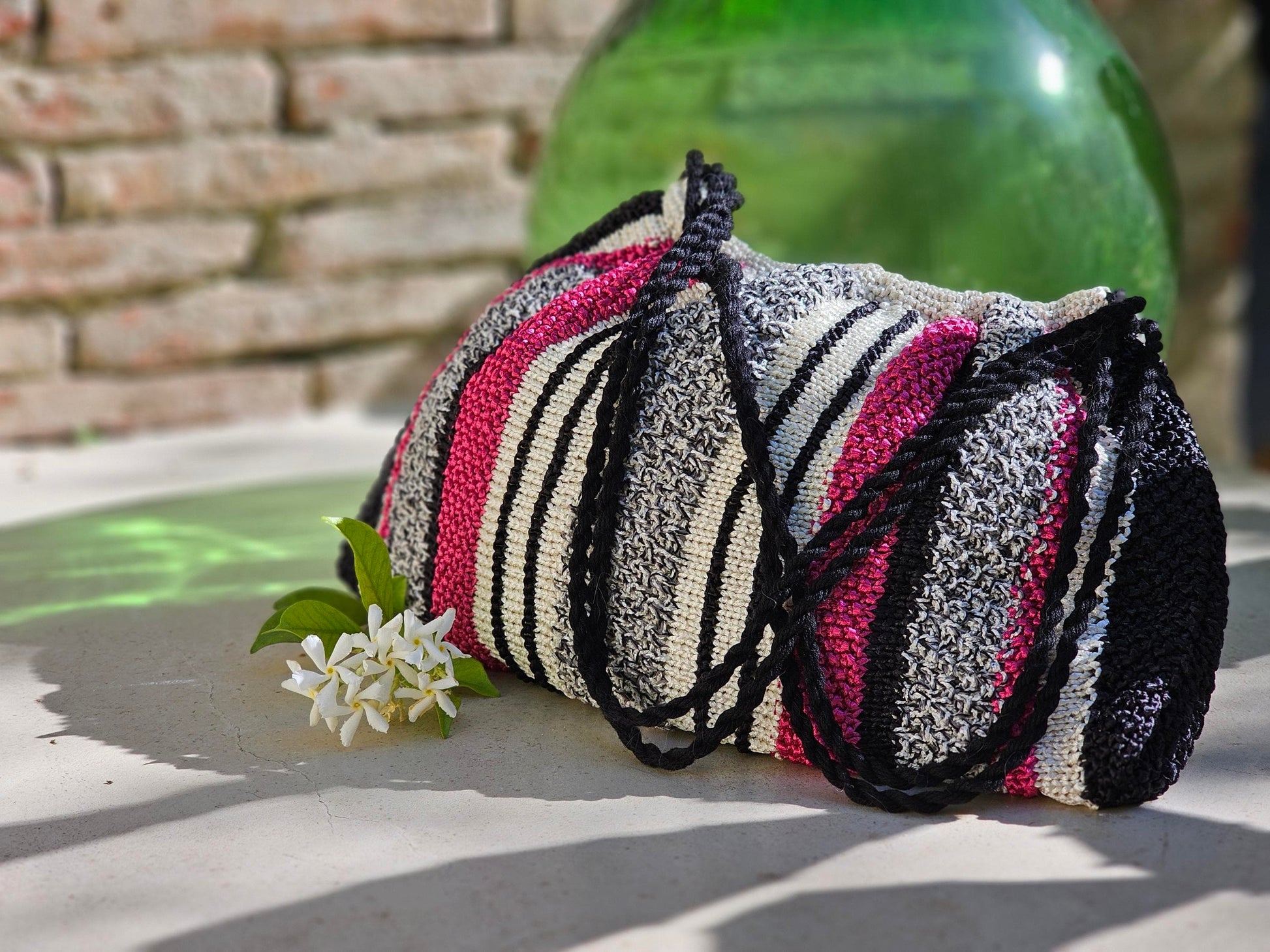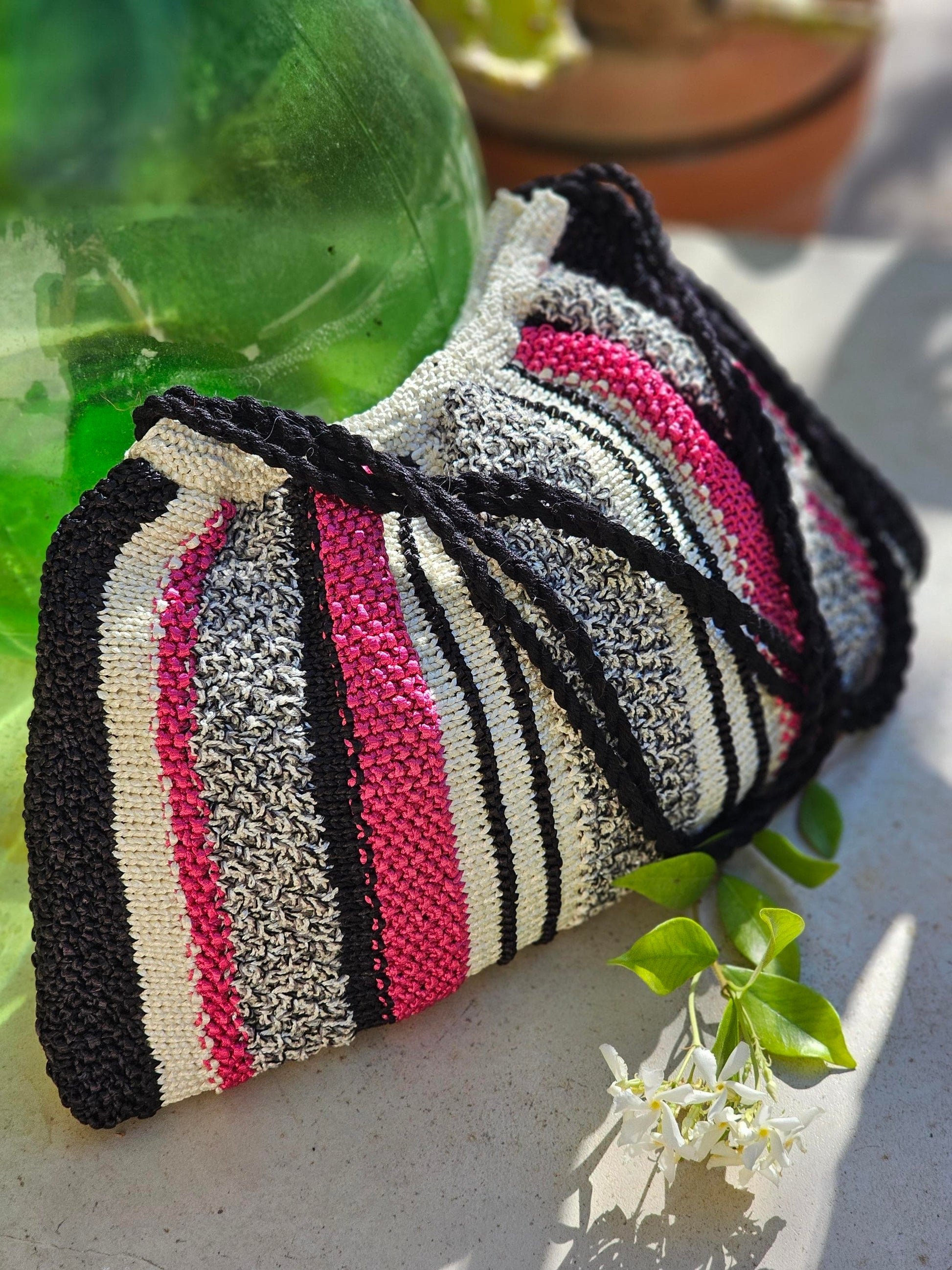 - Fil ruban satiné Victoria tricoté avec le fil fantaisie Divine à sequins. Les anses sont réalisées en coton Riviera.